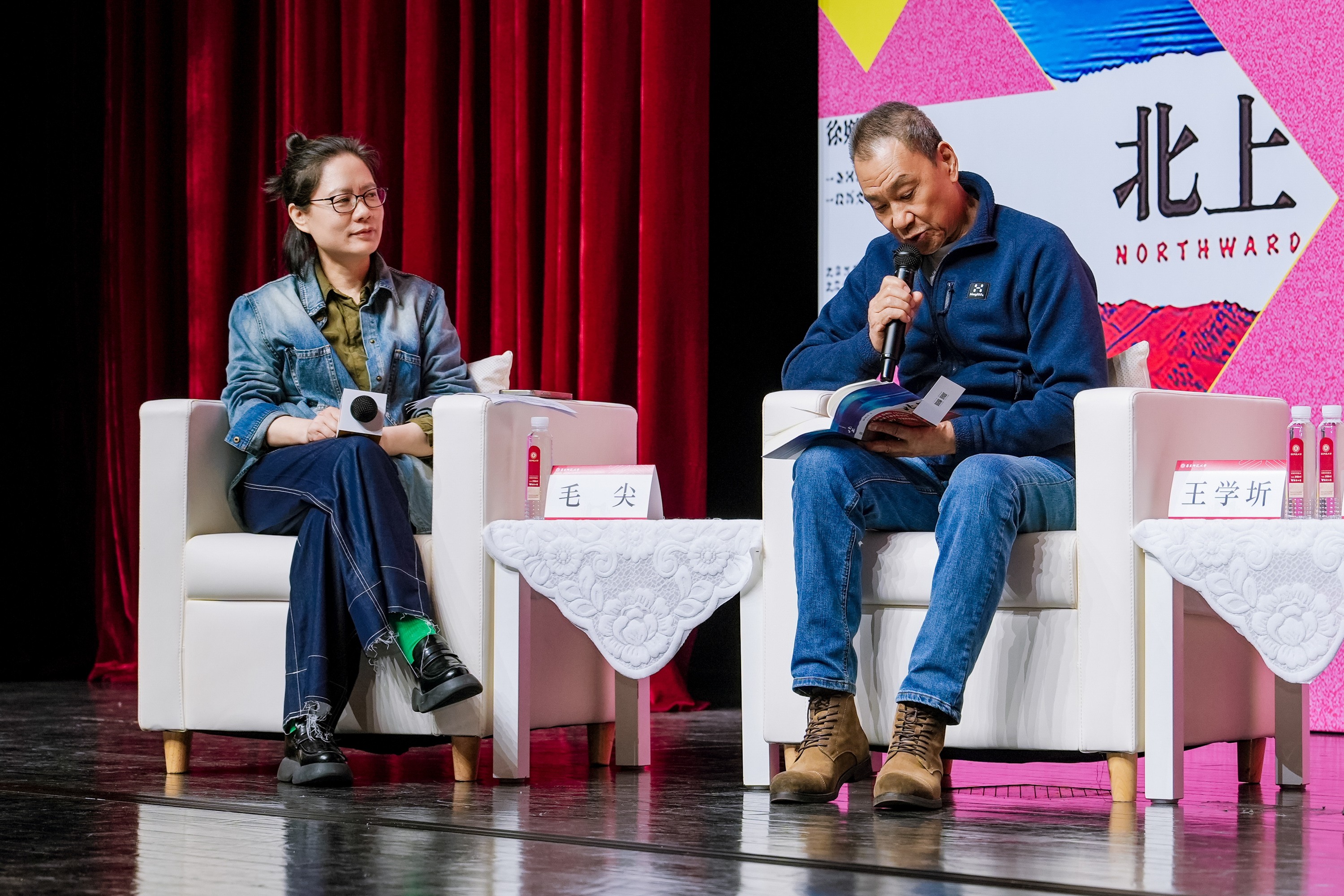 對談環節伊始,主持人毛尖特別邀請著名演員王學圻朗讀小說《北上》經典段落。王學圻以深沉嗓音演繹船工與河流的厚重羈絆,引得全場掌聲久久不息。
