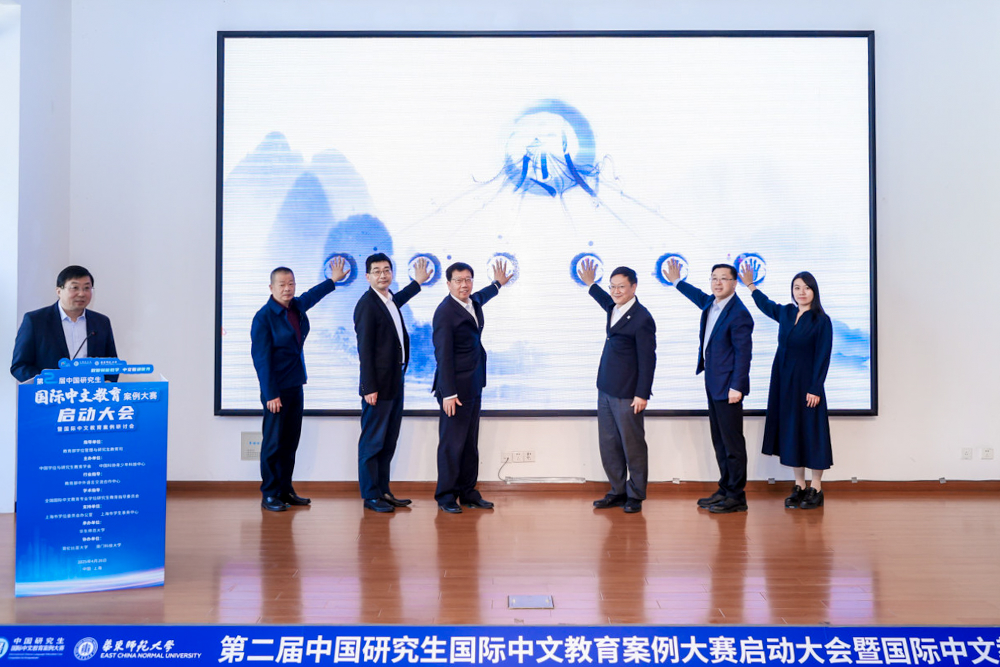 教育部中外語言交流合作中心副主任、大賽組委會主任委員胡志平,華東師范大學(xué)校長錢旭紅院士,國際中文教育基金會副理事長、國際中文教育專業(yè)學(xué)位研究生教指委副主任委員、北京語言大學(xué)原校長劉利,上海市教衛(wèi)工作黨委副書記、市教委副主任顧紅亮,以及大賽主辦單位中國學(xué)位與研究生教育學(xué)會賽事與合作部主任張雯,大賽支持單位上海市學(xué)生事務(wù)中心副主任王濤共同啟動第二屆中國研究生國際中文教育案例大賽。