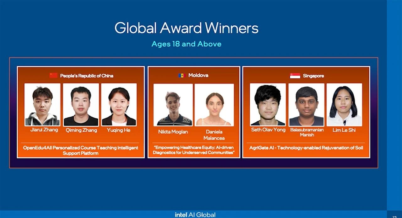 華東師范大學OpenEdu4All團隊(左一)斬獲2024年英特爾人工智能全球影響力嘉年華18歲以上年齡組全球大獎