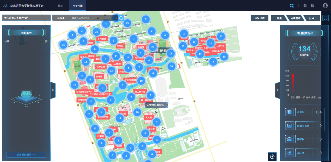 智慧消防管理平臺對兩校區(qū)100余棟建筑進行全覆蓋,實時監(jiān)測消防設備狀態(tài)和用水系統(tǒng)運行情況,借助分布式煙感、溫度傳感器等設備精準發(fā)現(xiàn)火災隱患,實時發(fā)出警報。