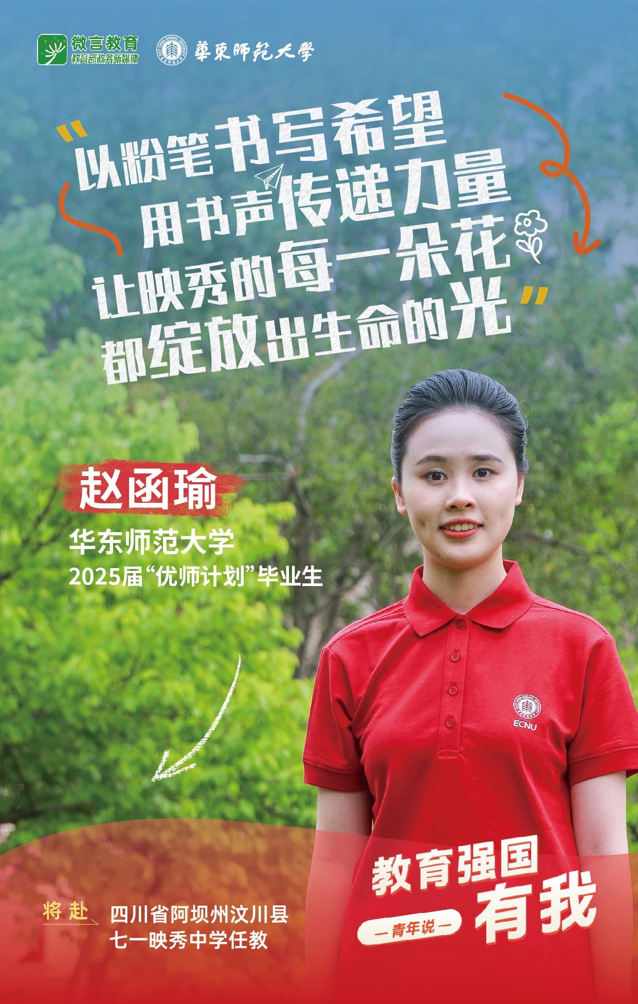 我是華東師范大學2025屆“優師計劃”畢業生趙函瑜,我將赴四川省阿壩州汶川縣七一映秀中學任教。以粉筆書寫希望,用書聲傳遞力量,讓映秀的每一朵花都綻放出生命的光。