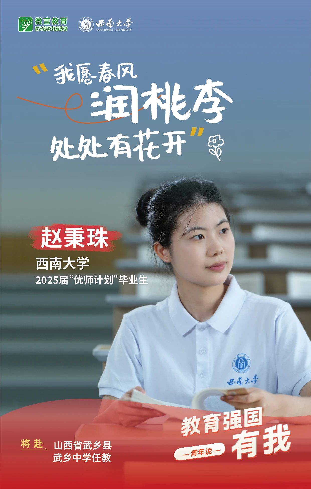 我是西南大學2025屆“優師計劃”畢業生趙秉珠,我將赴山西省武鄉縣武鄉中學任教。我愿春風潤桃李,處處有花開。