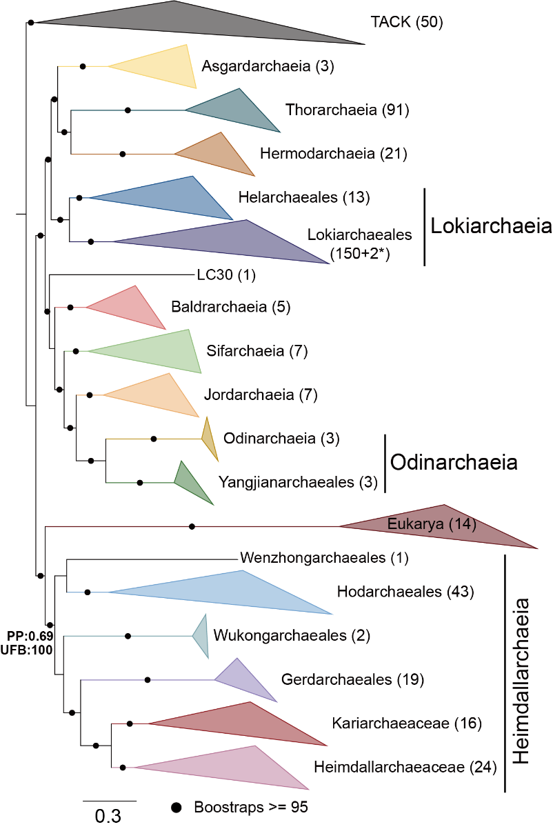 圖1 使用串聯(lián)67個標(biāo)志蛋白構(gòu)建的最大似然樹,顯示真核生物(Eukarya)與海姆達爾綱互為姐妹群系