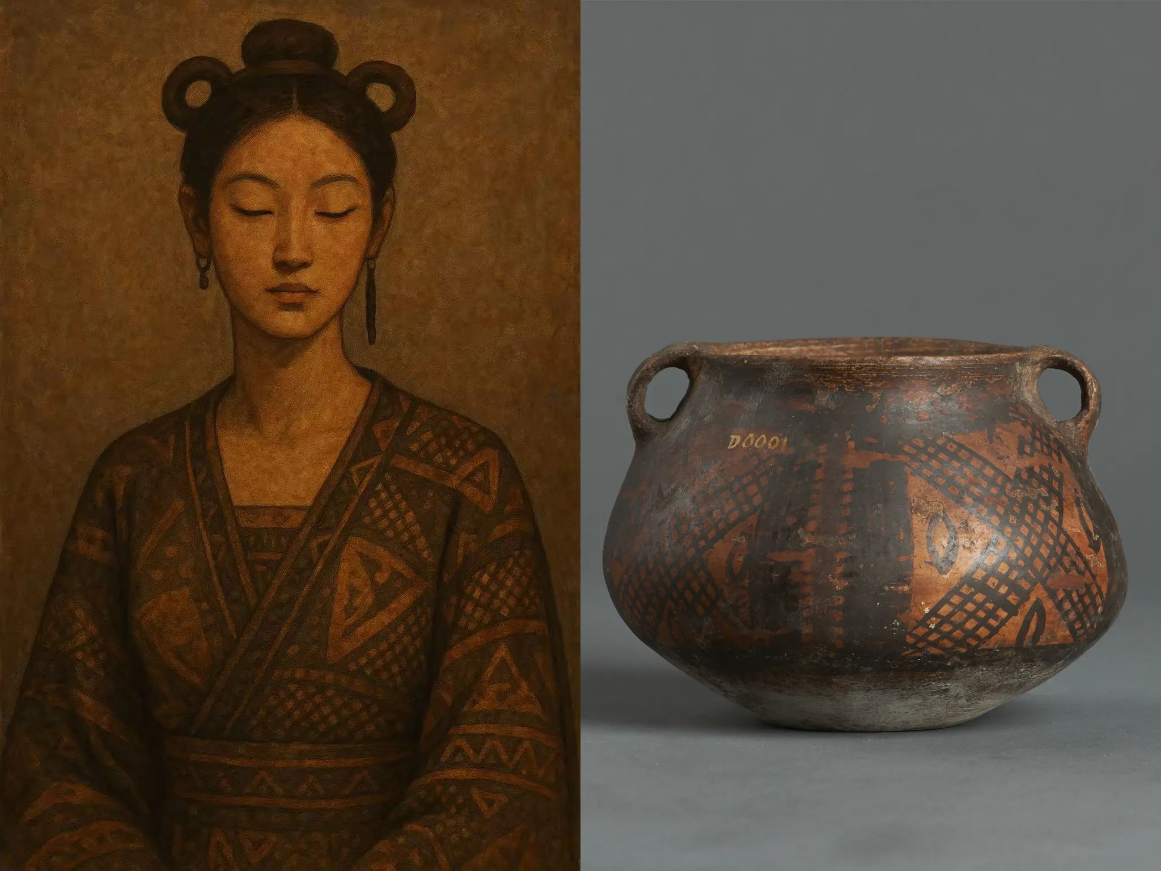 雙耳彩陶罐(新石器時(shí)代) 左圖為AI生成的陶器擬人