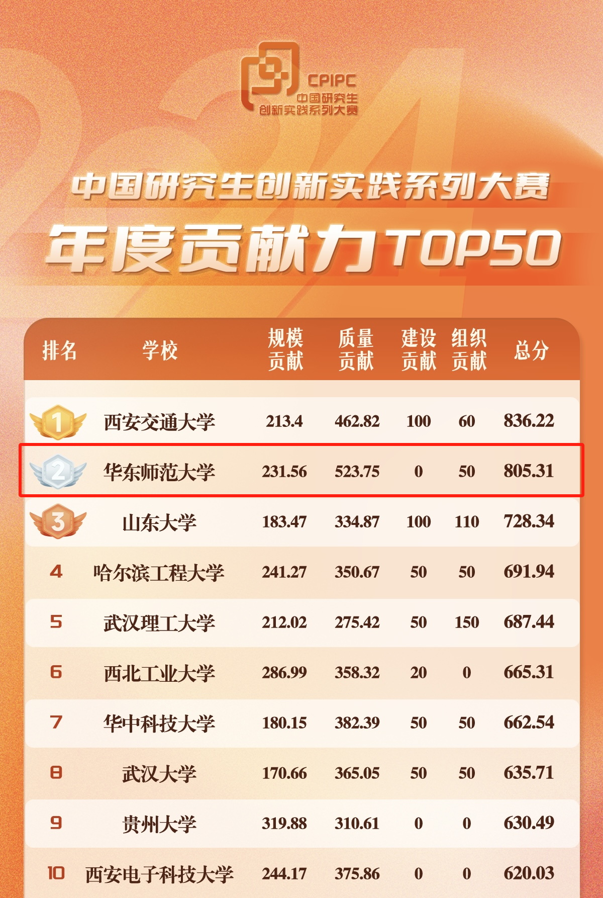 會上,《中國研究生創新實踐系列大賽2024 年度報告》正式發布。2024年中國研究生創新實踐系列大賽年度貢獻力排名,華東師大年度綜合貢獻力位居全國第二,質量貢獻力全國第一、規模貢獻力全國第十一。