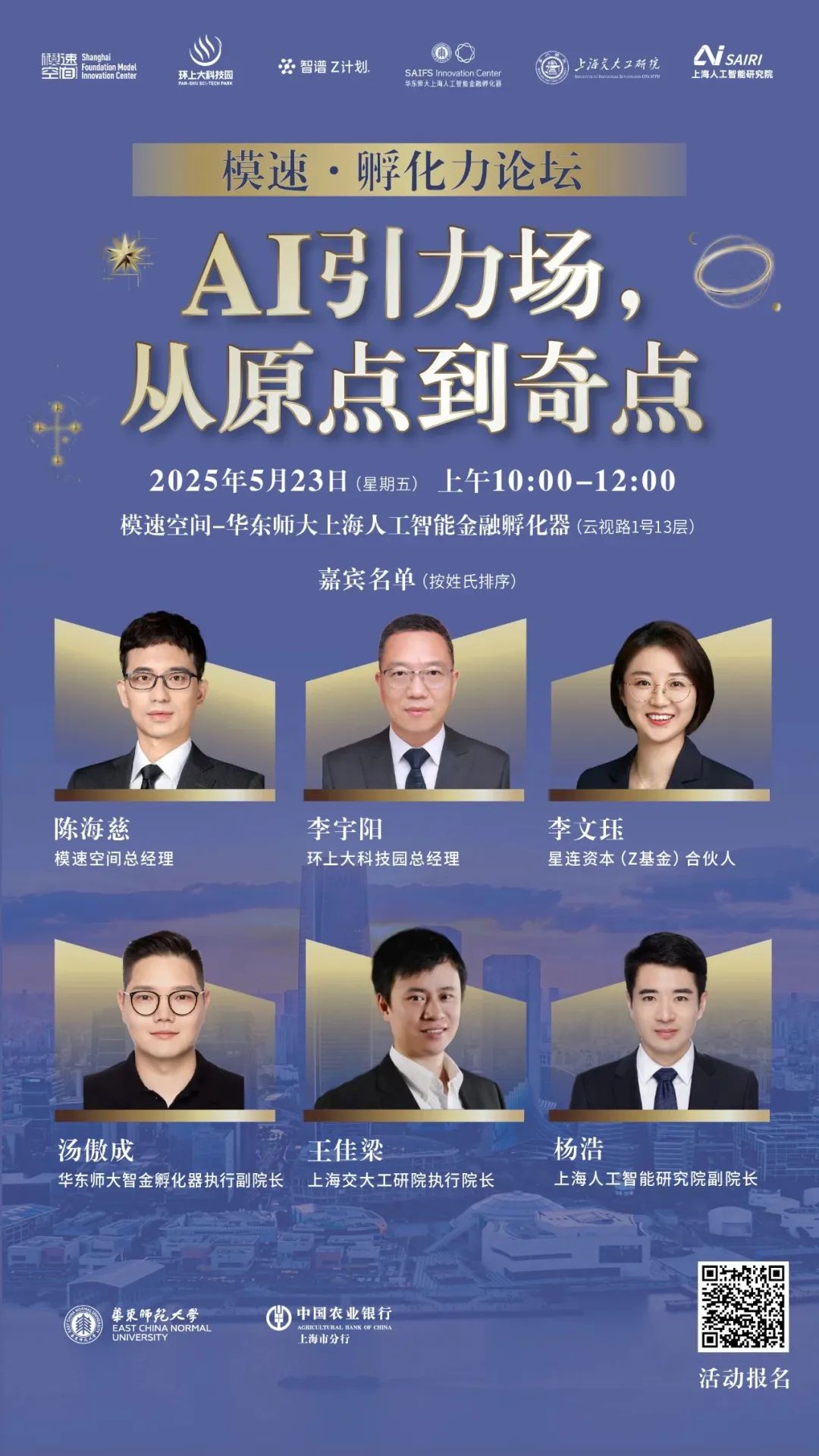 剛剛過去的五月,黃浦江畔迎來一場聚焦未來的思想盛宴——由華東師范大學上海人工智能金融產業研究院暨孵化器主辦,模速空間、交大工研院、環上大科技園、上海人工智能研究院、智譜Z計劃共同支持的“模速孵化力論壇”在模速空間舉行。