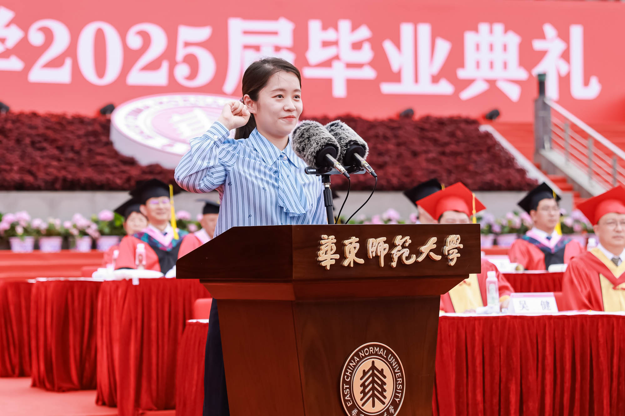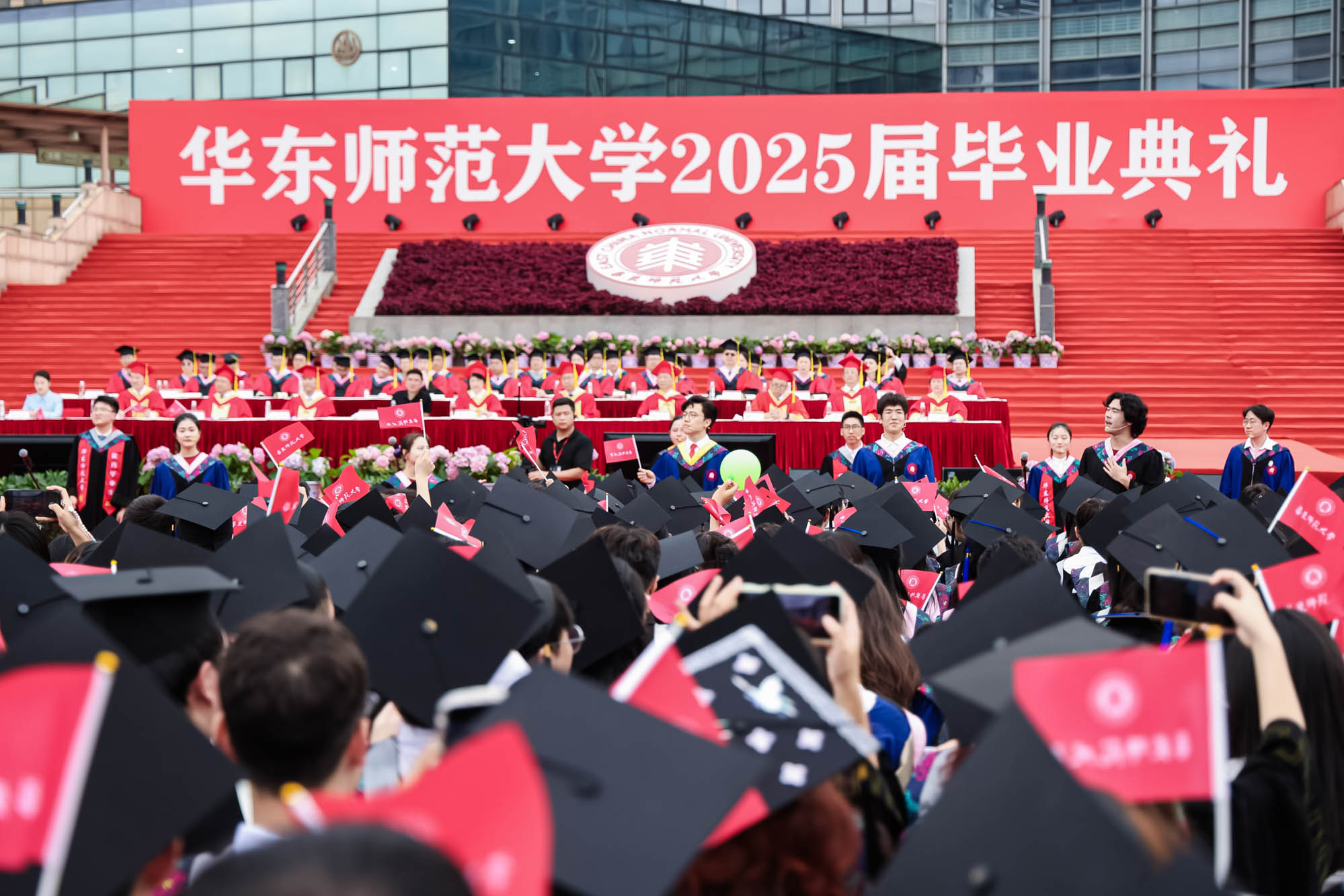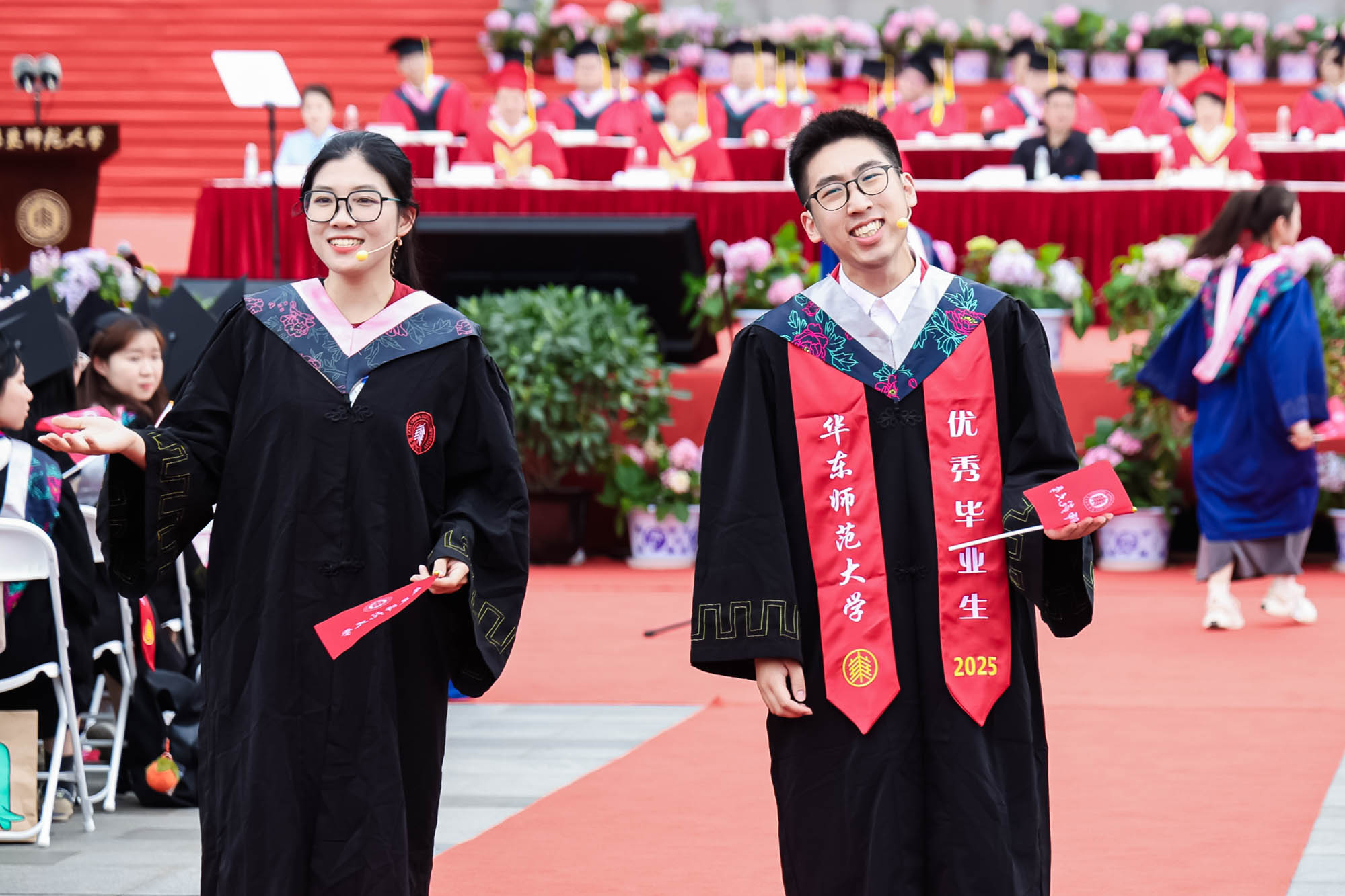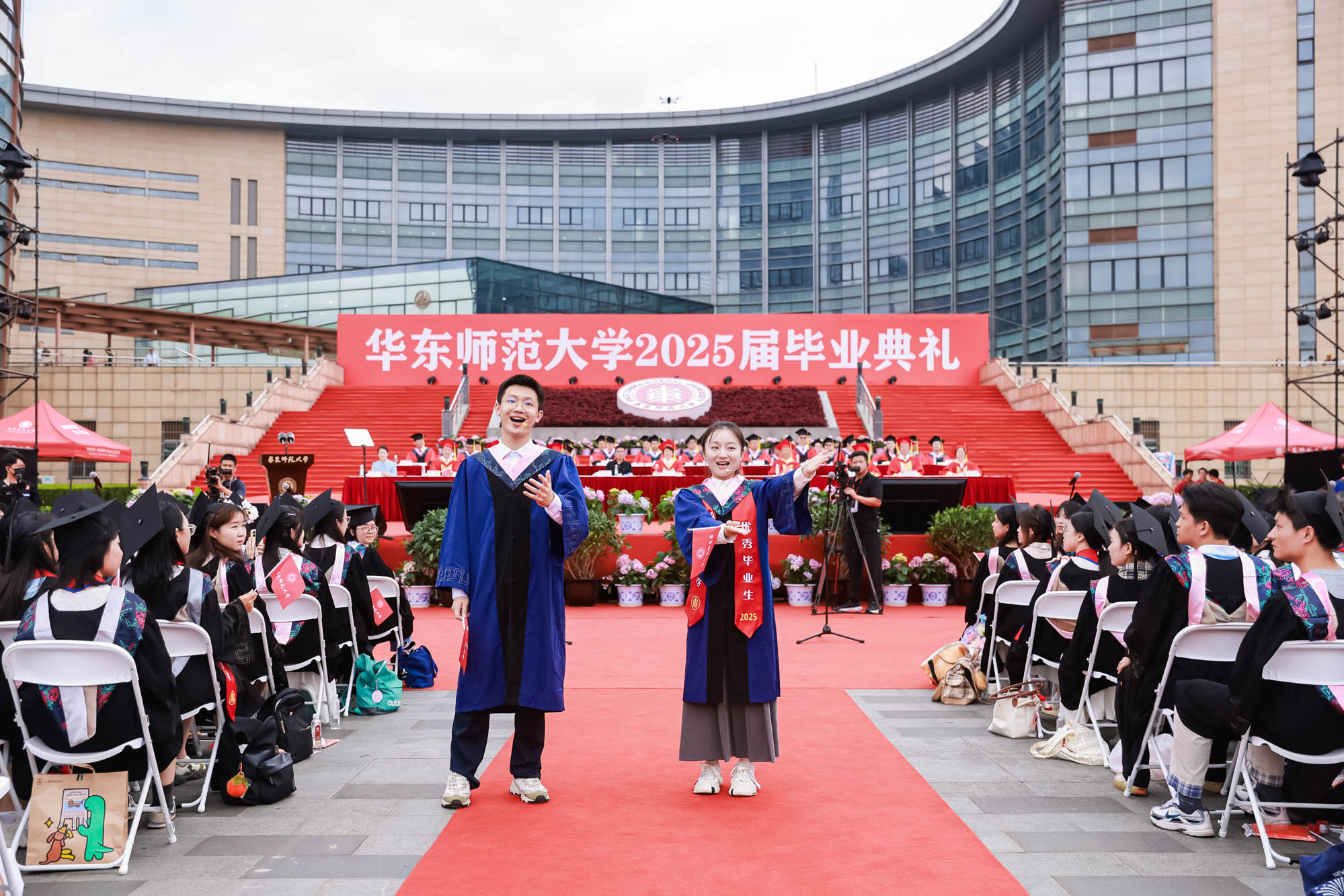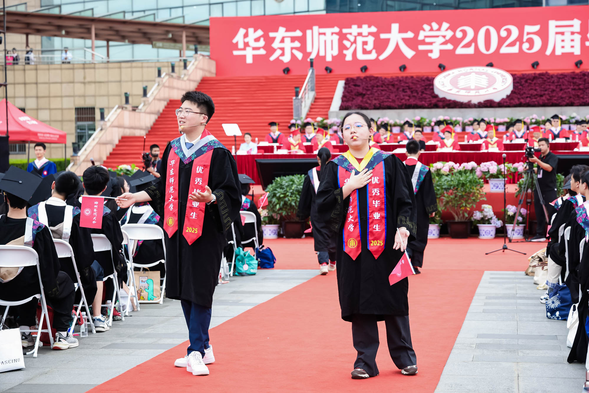 畢業典禮由華東師范大學統計學院教授於州和傳播學院2025屆本科生陳瑜瀟主持,并通過新華網教育頻道、央視頻、青年報和華東師大視頻號、微博、抖音、b站向全球進行直播。