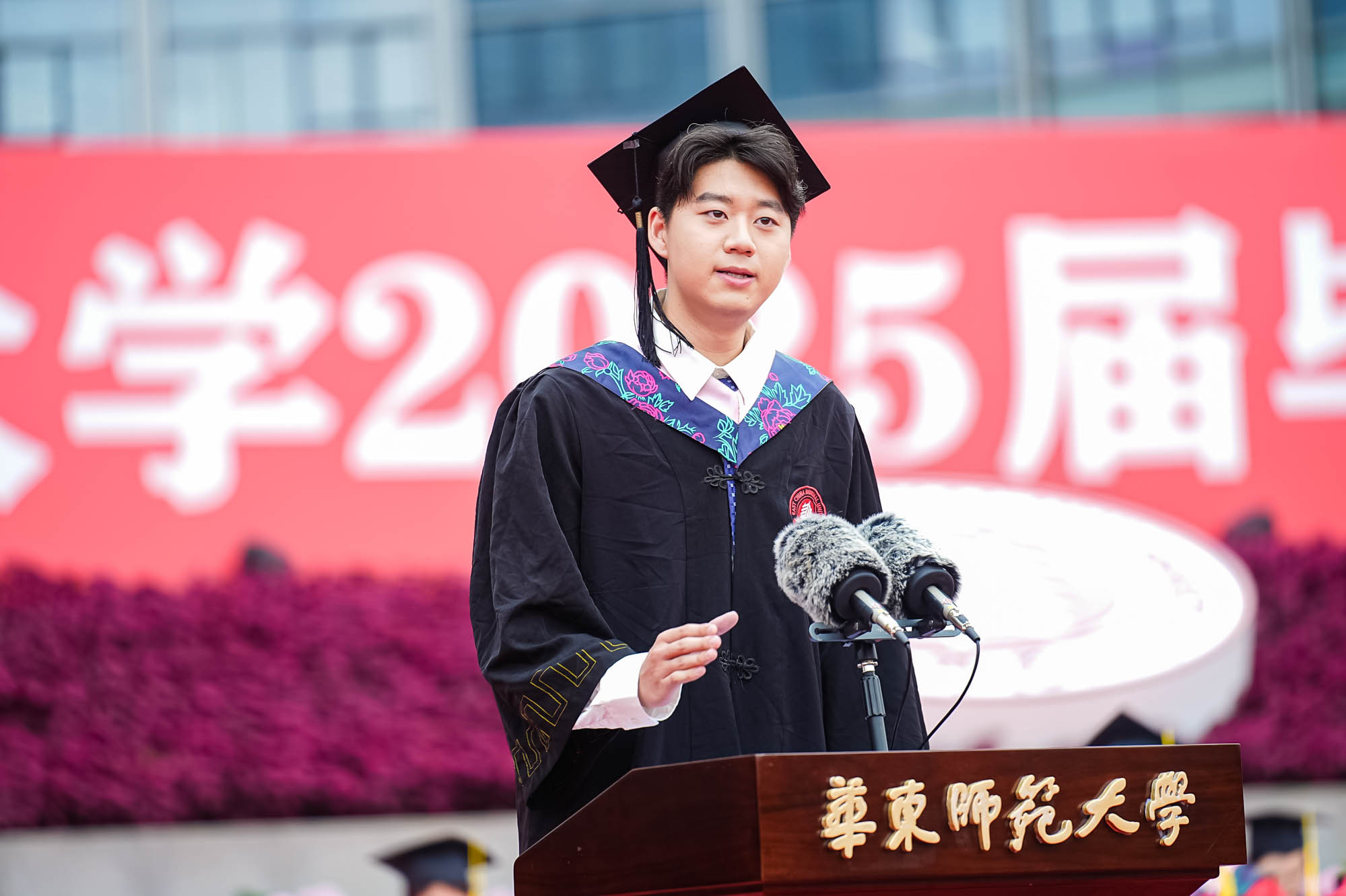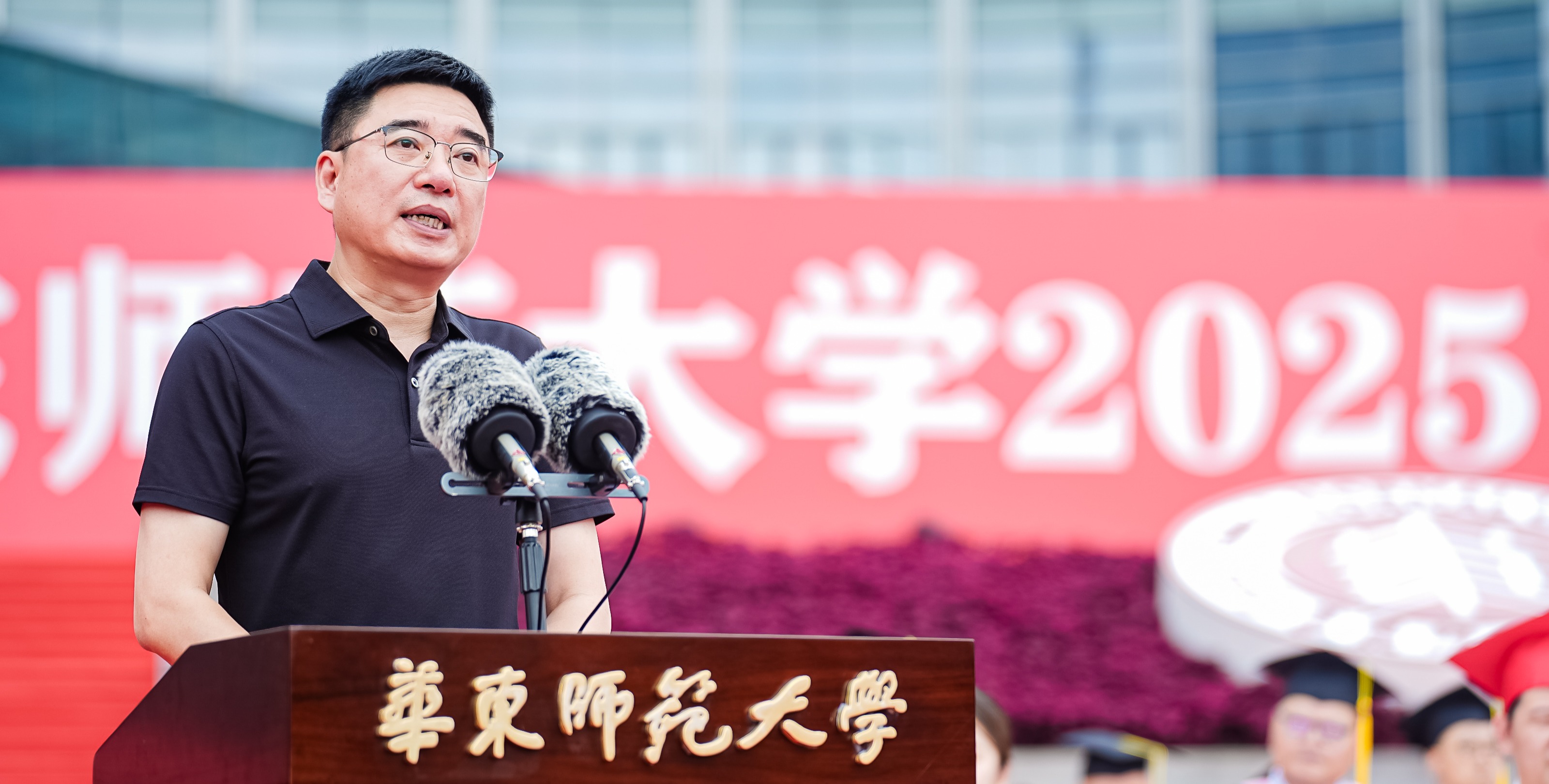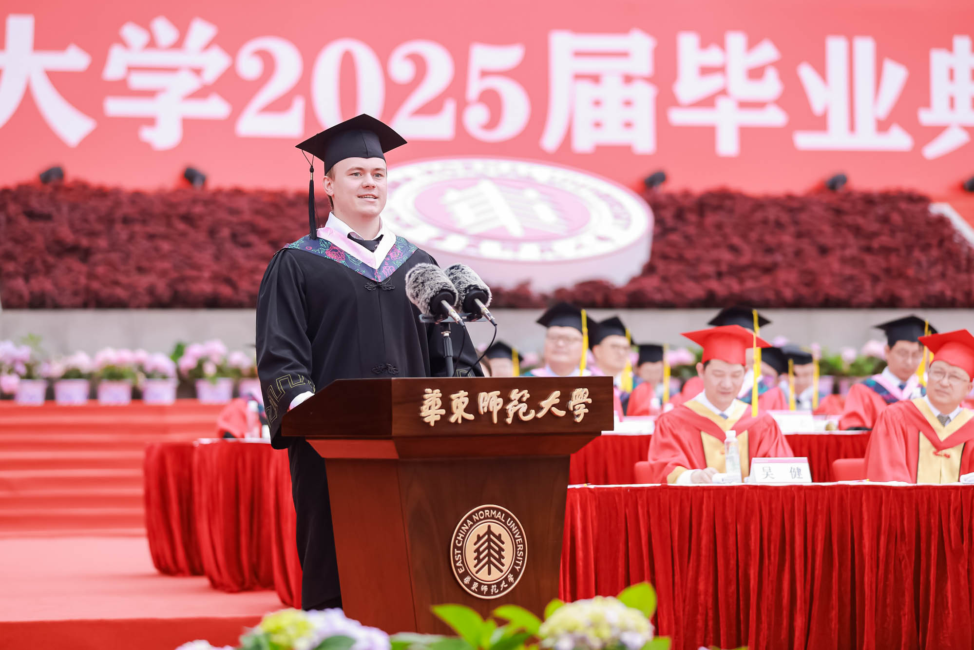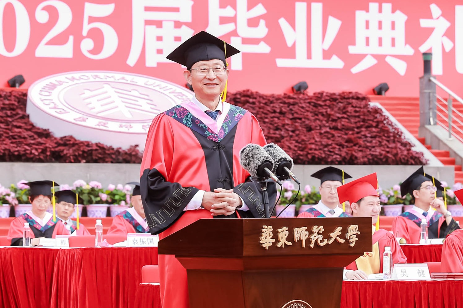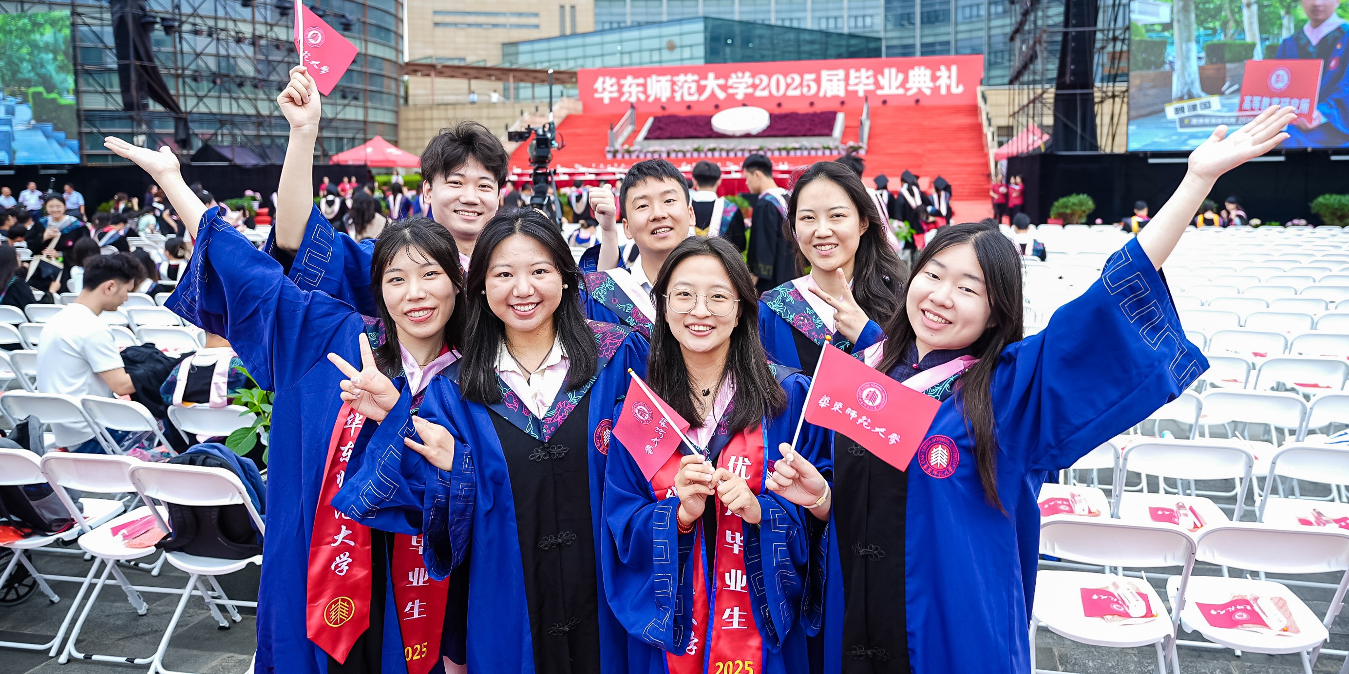 畢業典禮由華東師范大學統計學院教授於州和傳播學院2025屆本科生陳瑜瀟主持,并通過新華網教育頻道、央視頻、青年報和華東師大視頻號、微博、抖音、b站向全球進行直播。