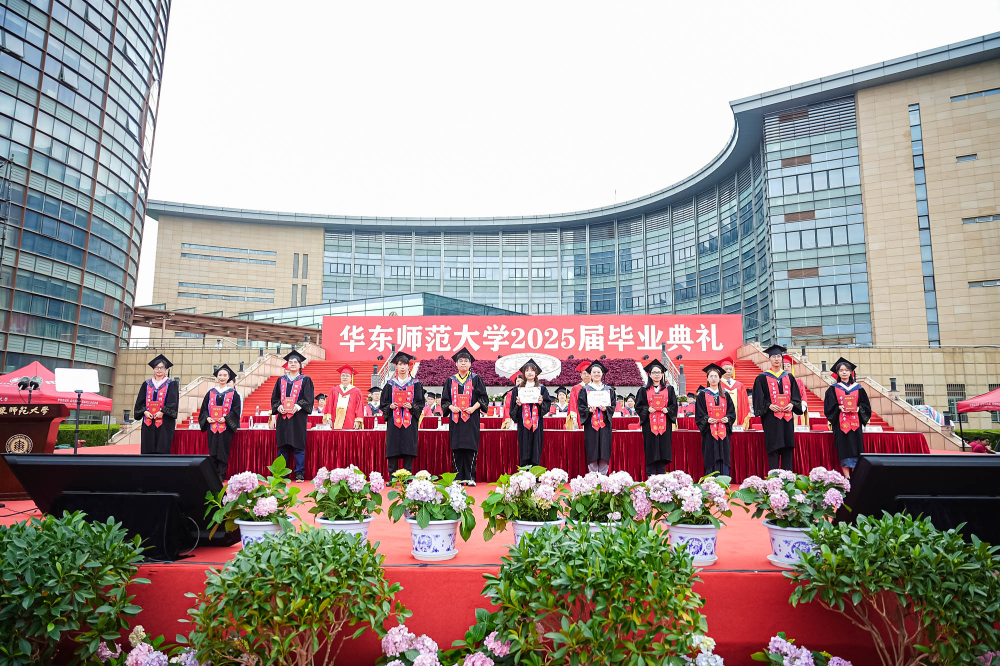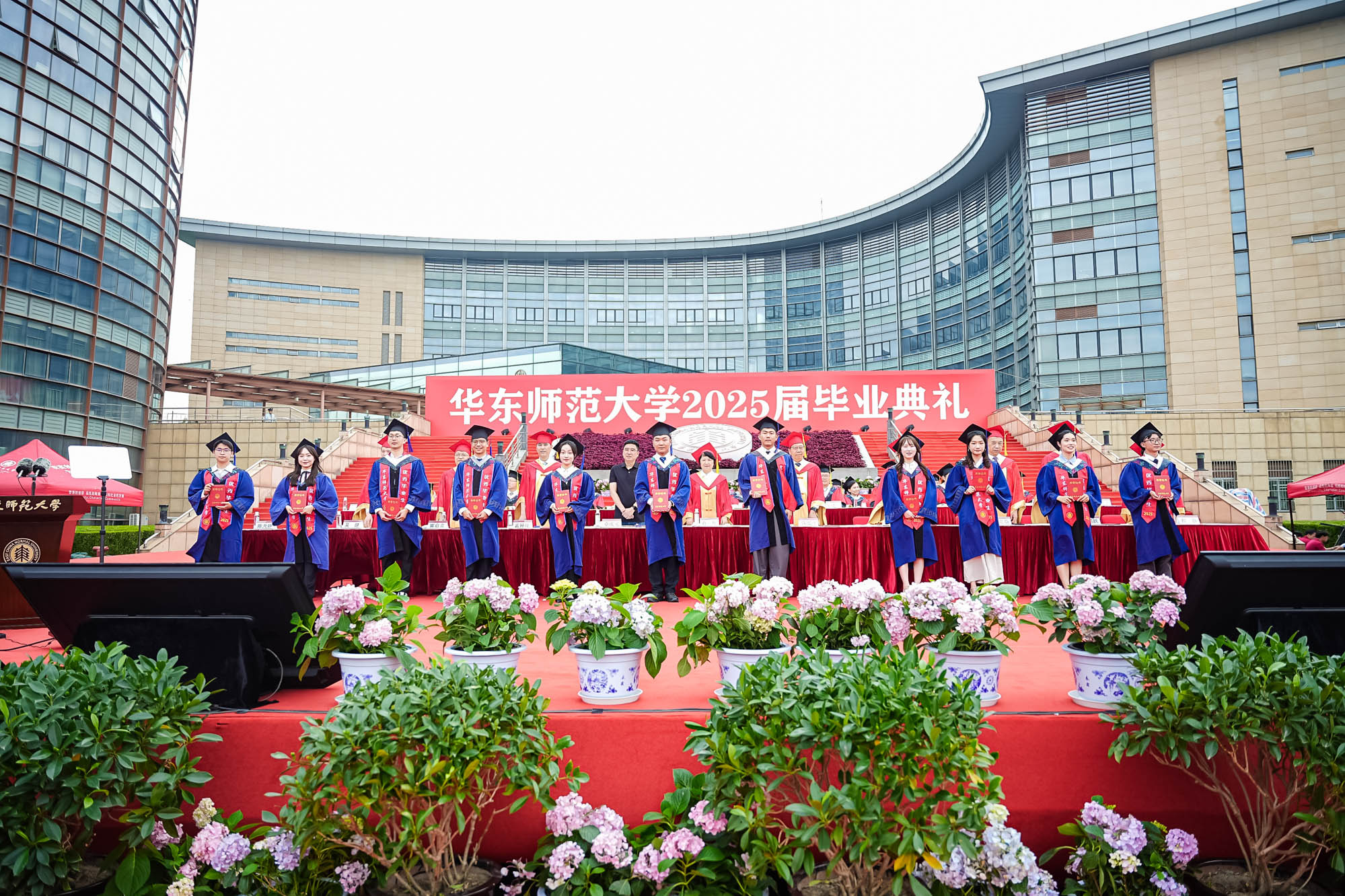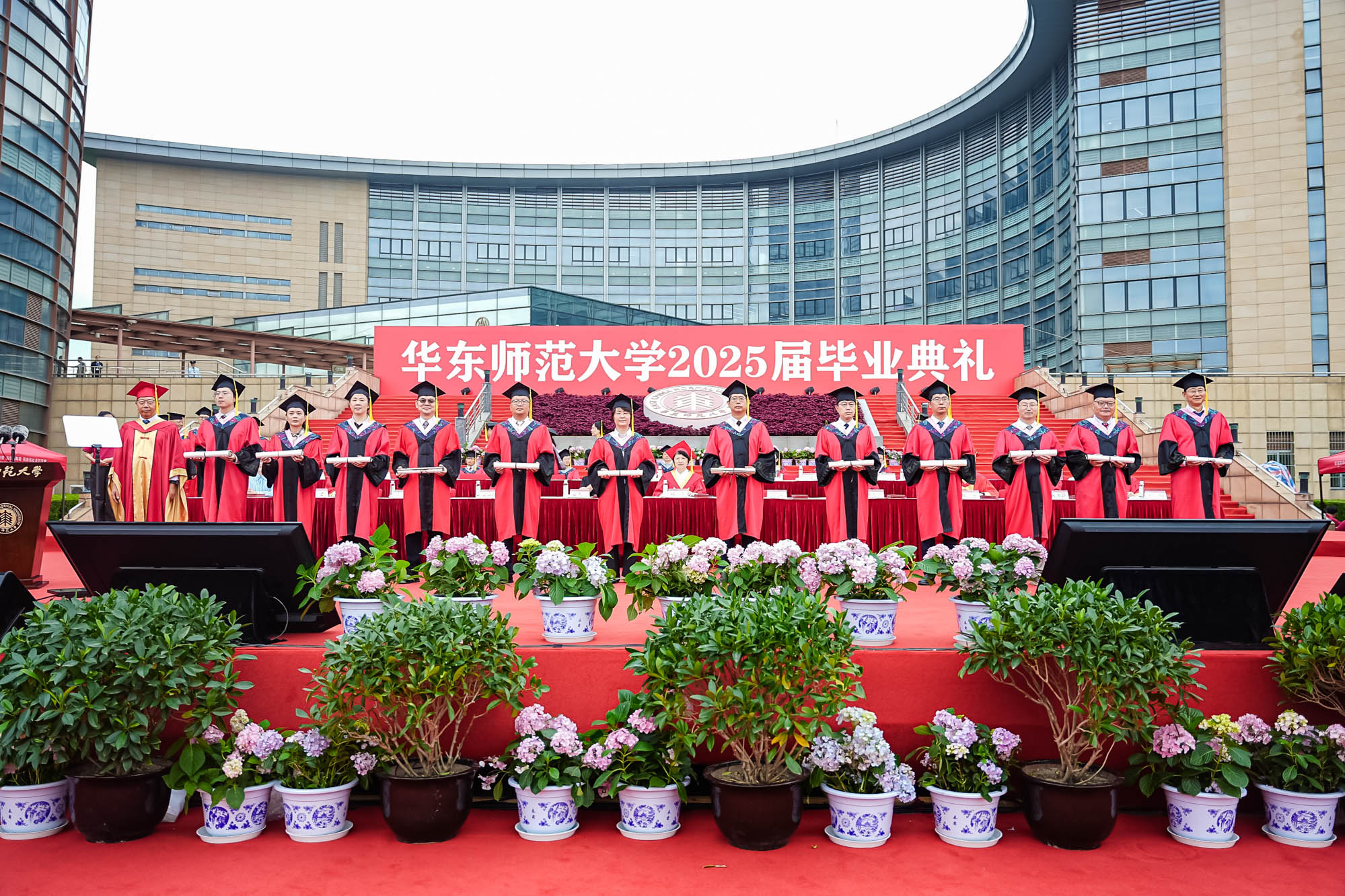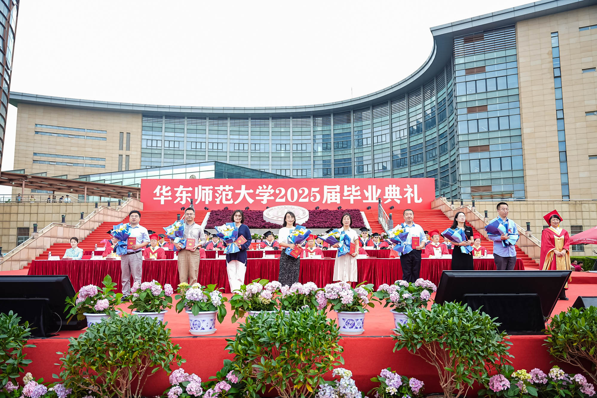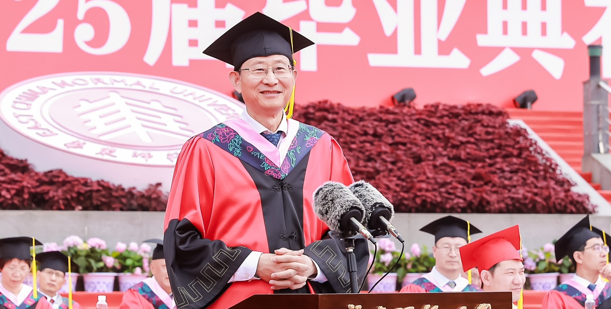 畢業典禮由華東師范大學統計學院教授於州和傳播學院2025屆本科生陳瑜瀟主持,并通過新華網教育頻道、央視頻、青年報和華東師大視頻號、微博、抖音、b站向全球進行直播。
