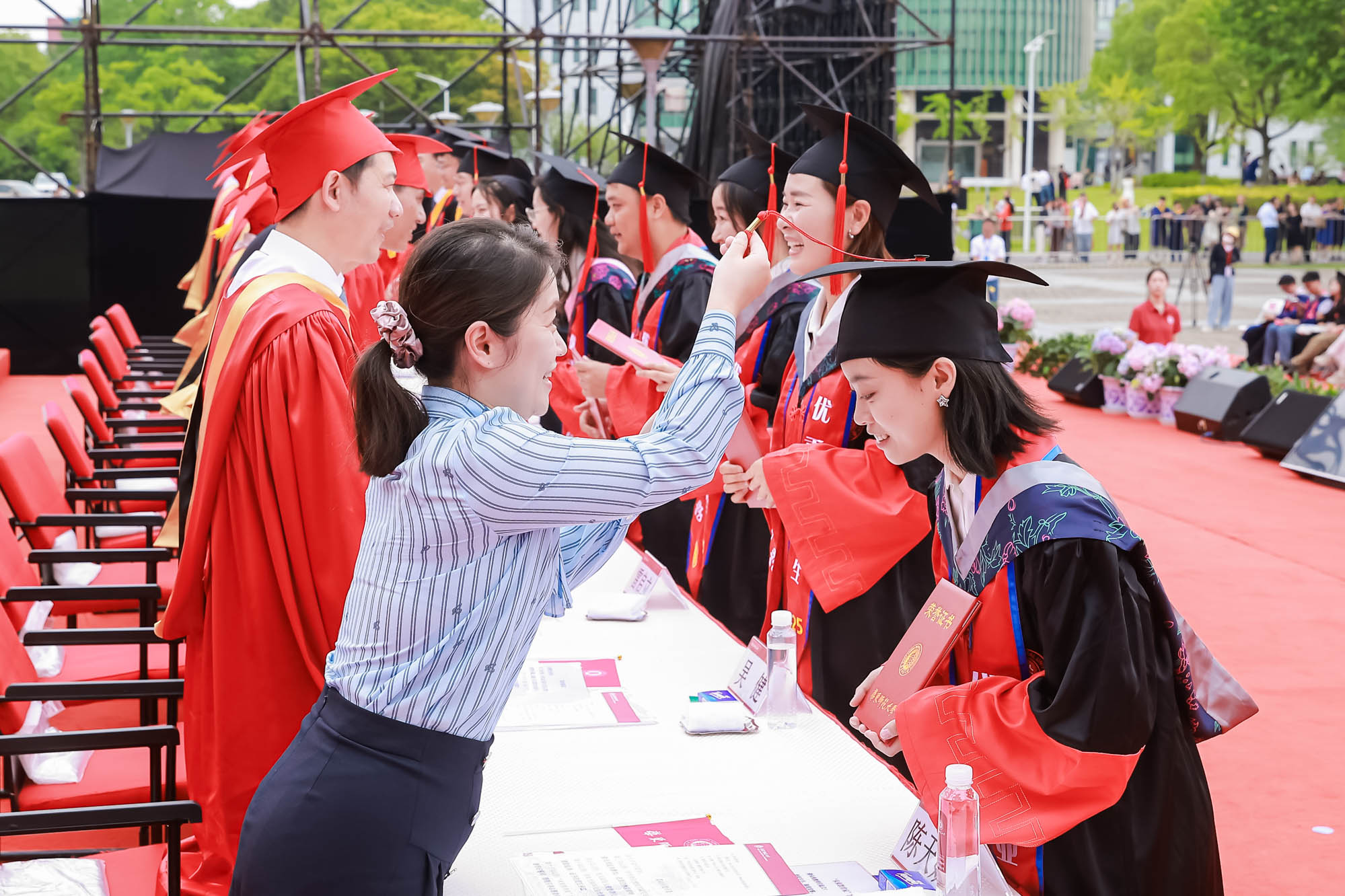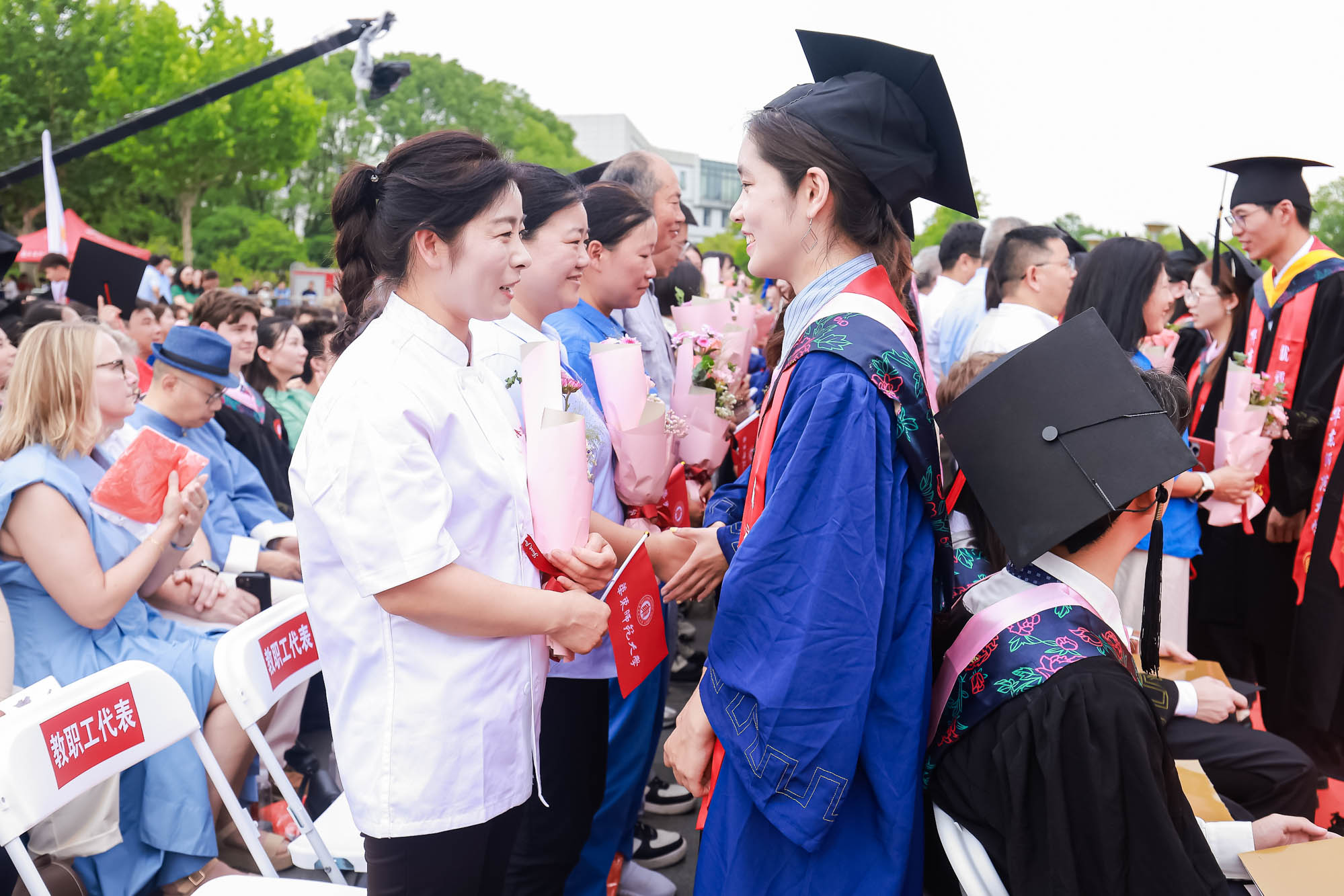 儀式現場,“學生身邊最可愛的人”為畢業生送上寄語,他們是校園保安、食堂師傅、宿管阿姨、校醫院醫生、圖書館工作人員、輔導員、教務員、維修及校園環境員工們等。他們用日復一日的平凡堅守,編織起畢業生們最溫暖的校園記憶。畢業生代表手捧鮮花,獻給在學校各個崗位上默默耕耘的老師們,并致以最深的敬意與感激。