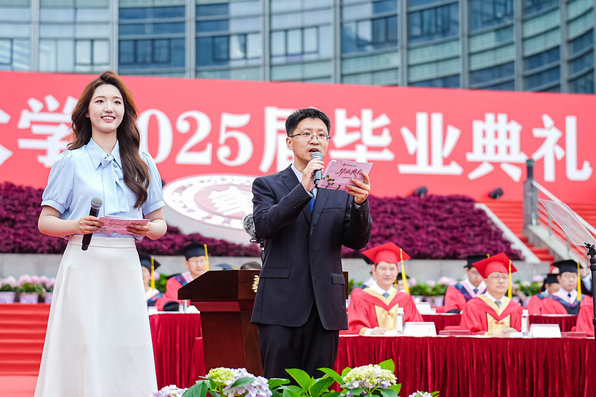 畢業典禮由統計學院教授於州和傳播學院2025屆本科生陳瑜瀟主持