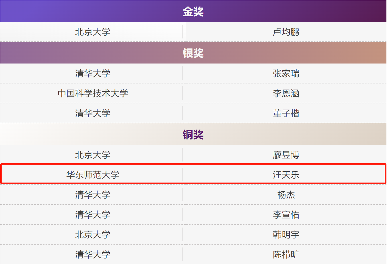近日,第十六屆丘成桐大學生數學競賽舉辦。華東師大數學科學學院2021級本科生汪天樂憑借扎實功底和出色表現榮獲分析與偏微分方程方向個人單項銅獎,獲得我校在該賽事上的首枚獎牌。