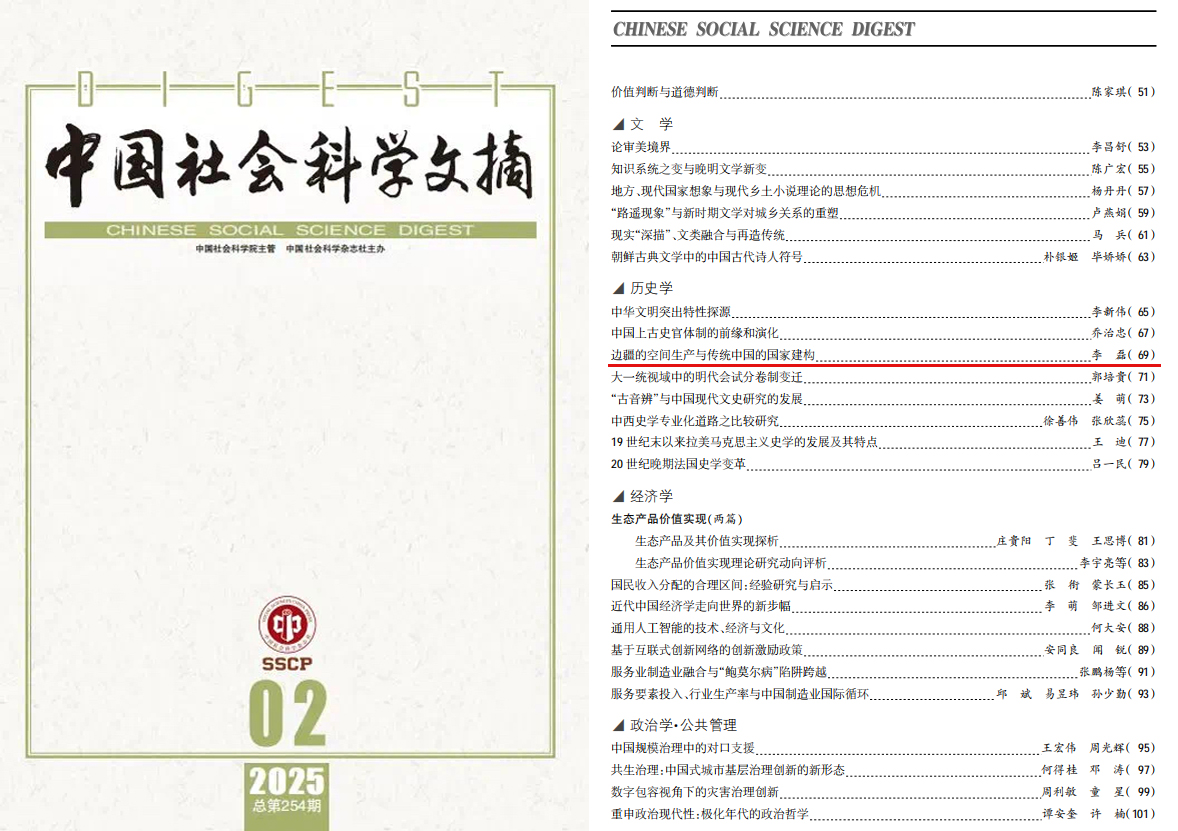 |李磊教授文章被《中國社會科學文摘》全文轉載,探討邊疆的空間生產與傳統中國的國家建構
