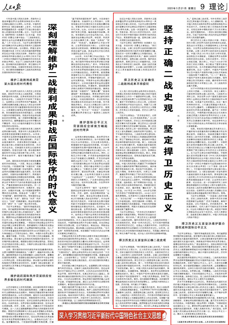 華東師范大學政治與國際關系學院教授劉軍《堅持正確二戰史觀 堅定捍衛歷史正義(深入學習貫徹習近平新時代中國特色社會主義思想)》一文刊登在2025年5月21日《人民日報》。