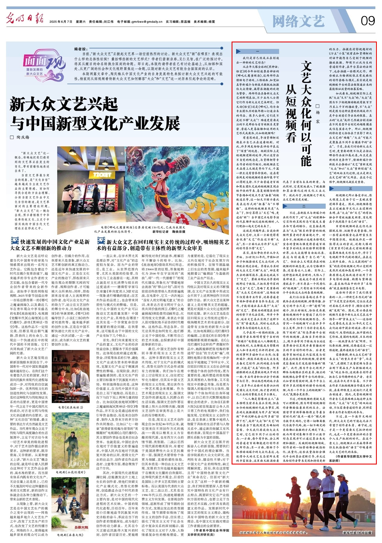 華東師范大學中文系講師楊宸《從短視頻看文藝大眾化何以可能》一文刊登在2025年6月7日《光明日報》。