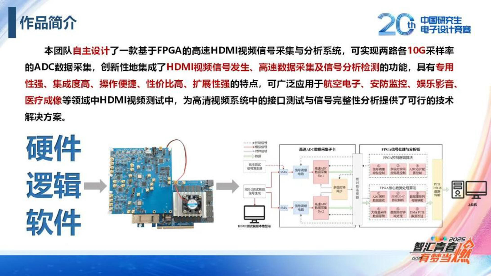“VQ-TECH”團隊自主設計了一款基于FPGA的高速HDMI視頻信號采集與分析系統,可實現兩路各10G采樣率的ADC數據采集,創新性地集成了HDMI視頻信號發生、高速數據采集、信號分析檢測三大功能,具有專用性強、集成度高、操作便捷、性價比高、擴展性強五大特點,可廣泛應用于航空電子、安防監控、娛樂影音、醫療成像等領域中的HDMI視頻測試中,為高清視頻系統中的接口測試與信號完整性分析提供了可行的技術解決方案。