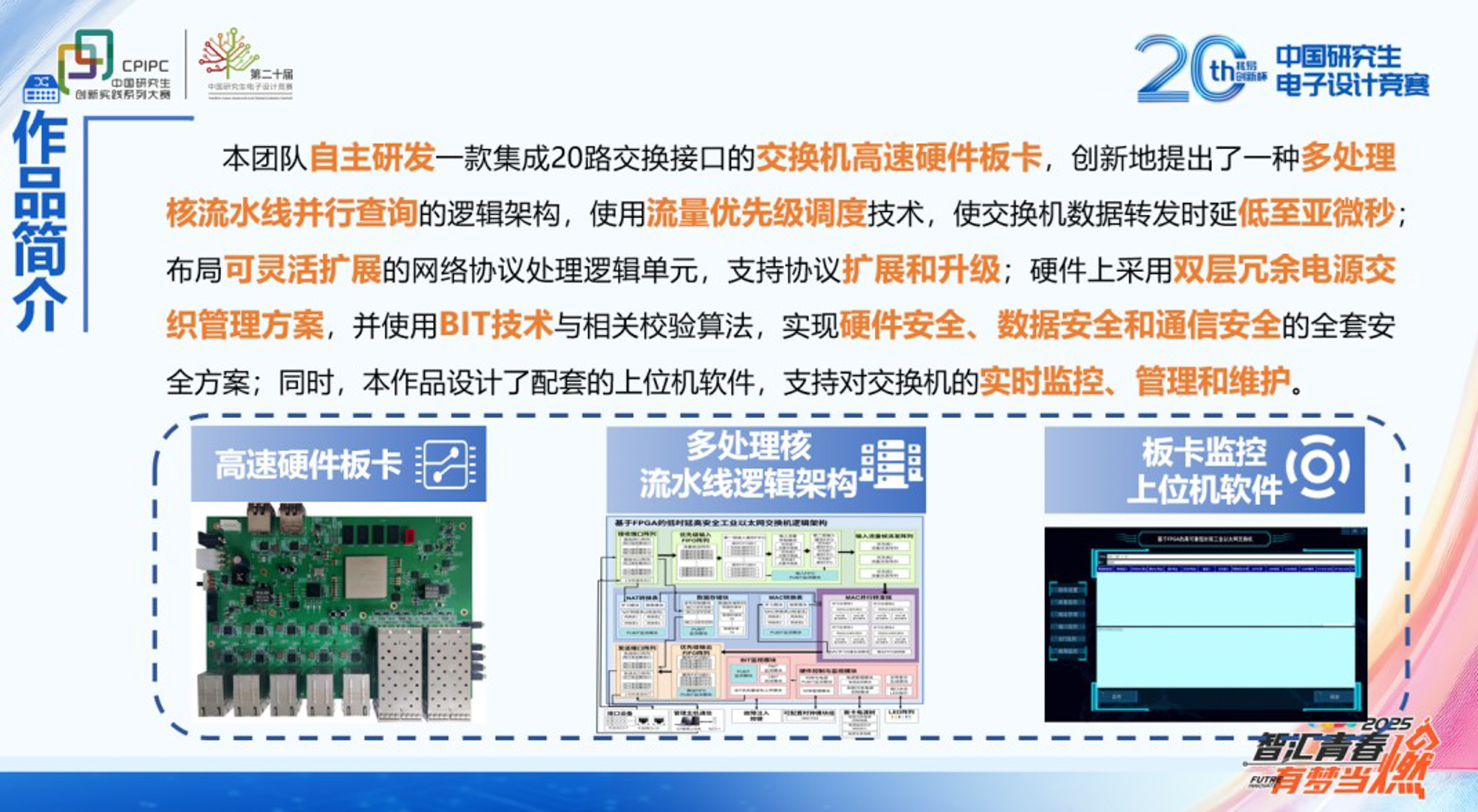 “脈向芯幀成”團隊主要針對當前交換機在實時性、高安全傳輸兩個方面的需求,開發出一套硬件邏輯安全方案,創新性提出邏輯多處理核流水線并行查詢的邏輯架構。該架構將數據轉發時延降至0.77us,同時支持硬件狀態上報,可實現提前預警,有效保障系統安全運行。