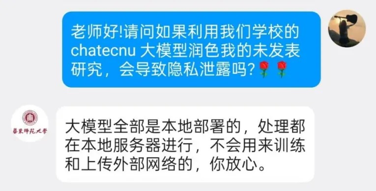 特別關注數據安全的你,上述問題是否也曾讓你猶豫使用大模型。未發表的論文會不會被泄露?研發中的技術能否得到保護?其他模型是否會“偷學”在研學術成果?使用ChatECNU,以上問題無需擔心——全流程本地化部署,數據不出校園;不存儲、不使用未發表內容訓練其他模型;隱私安全有保障,對話內容僅你可見。