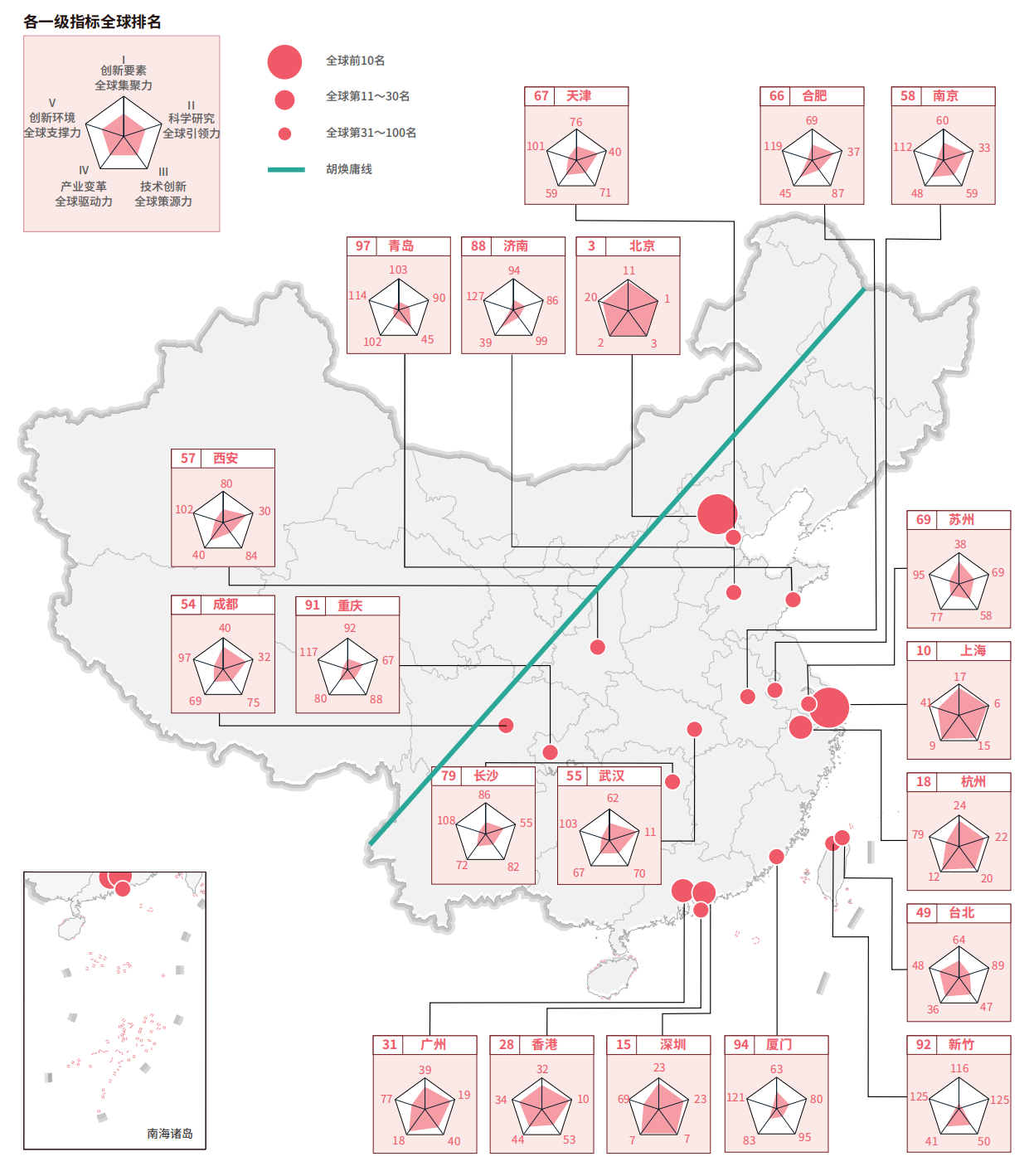 同時,中國科技創(chuàng)新中心在綜合能級上實現(xiàn)突破,北京綜合排名超越倫敦,首次躍居全球第3位,僅次于舊金山灣區(qū)和紐約,上海則穩(wěn)居全球第10位,繼續(xù)保持全球科技創(chuàng)新中心第一方隊地位。深圳、杭州、香港均位列前30強。