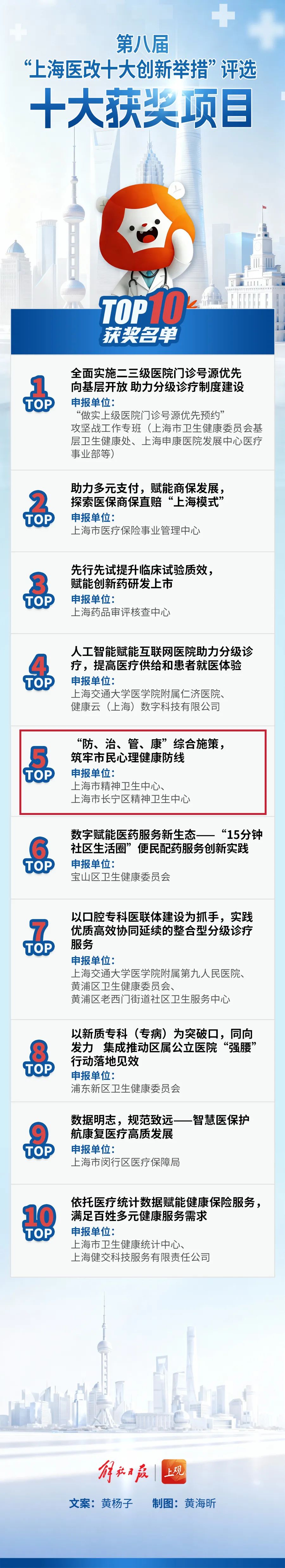 近日,第八屆“上海醫(yī)改十大創(chuàng)新舉措”揭曉。華東師大附屬精神衛(wèi)生中心(長(zhǎng)寧區(qū)精神衛(wèi)生中心)聯(lián)合上海市精神衛(wèi)生中心共同申報(bào)的“‘防、治、管、康’綜合施策,筑牢市民心理健康防線”項(xiàng)目入選。該評(píng)選由上海市衛(wèi)生健康委、上海市醫(yī)保局、上海市藥監(jiān)局指導(dǎo),由《解放日?qǐng)?bào)》聯(lián)合上海市衛(wèi)生和健康發(fā)展研究中心組織開展、上海市健康促進(jìn)中心、上海市衛(wèi)生經(jīng)濟(jì)學(xué)會(huì)協(xié)辦。該評(píng)選自3月啟動(dòng)以來(lái),全市各辦醫(yī)主體、醫(yī)療衛(wèi)生機(jī)構(gòu)踴躍推薦、積極申報(bào),共收到122家單位推薦申報(bào)的142條舉措,申報(bào)數(shù)量創(chuàng)歷年之最。首輪遴選產(chǎn)生47項(xiàng)舉措,后經(jīng)專家評(píng)審產(chǎn)生30項(xiàng)入圍舉措,并于9月在“健康上海12320”平臺(tái)和“上觀新聞”APP接受網(wǎng)絡(luò)投票。本屆項(xiàng)目申報(bào)單位主要為衛(wèi)生健康行政部門、各級(jí)醫(yī)療衛(wèi)生機(jī)構(gòu),同時(shí),還收到來(lái)自醫(yī)保、藥監(jiān)部門推薦的多項(xiàng)創(chuàng)新舉措,從評(píng)選機(jī)制和舉措來(lái)源上更多體現(xiàn)“三醫(yī)聯(lián)動(dòng)”。