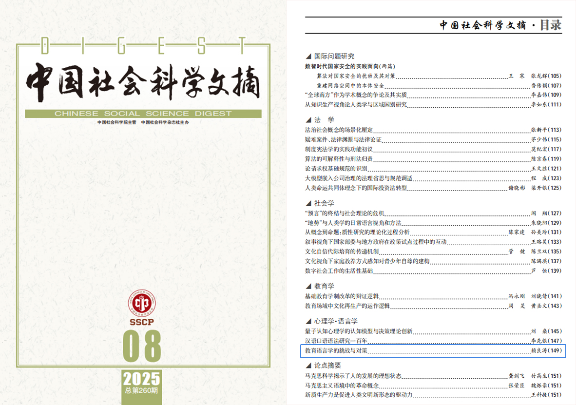 10|賴良濤教授文章被《中國社會科學(xué)文摘》全文轉(zhuǎn)載,探討教育語言學(xué)的挑戰(zhàn)與對策