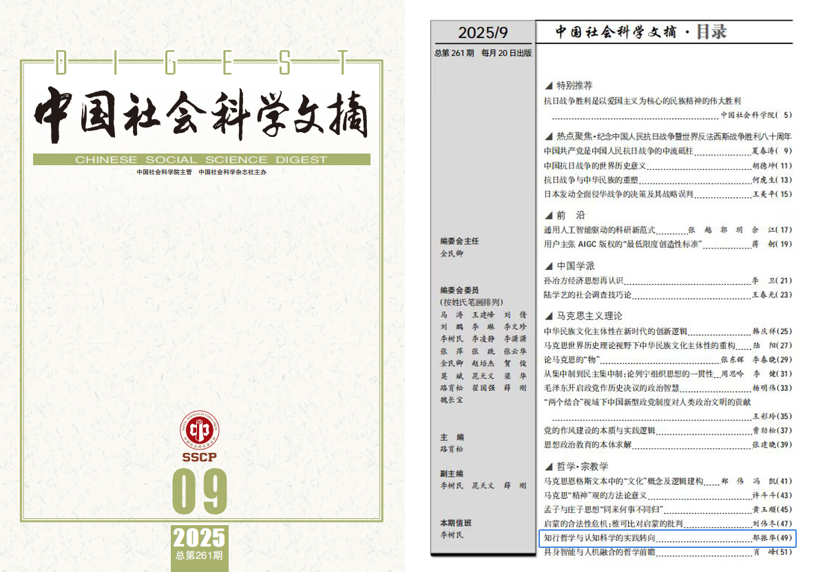 華東師范大學(xué)中國現(xiàn)代思想文化研究所暨哲學(xué)系教授郁振華《知行哲學(xué)與認(rèn)知科學(xué)的實踐轉(zhuǎn)向》一文被《中國社會科學(xué)文摘》2025年第9期轉(zhuǎn)載。文章摘自2025年第4期《社會科學(xué)》。