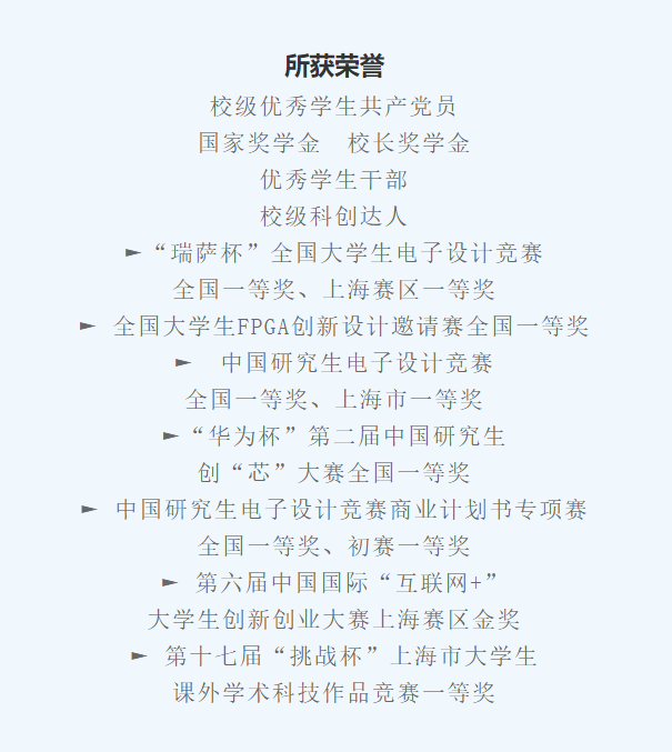 2019年,周家輝帶隊參加“華為杯”研究生創“芯”大賽,憑借《MEMS數字微鏡陣列CMOS電路設計》項目一舉拿下了全國一等獎。2020年,他首次參加“互聯網+”大學生創新創業大賽,又獲得了上海市金獎。