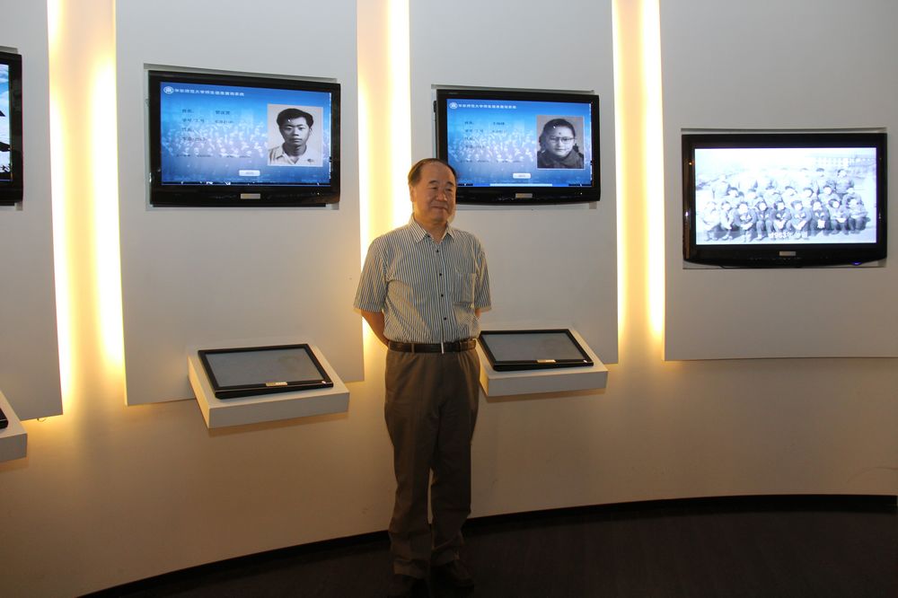 參觀校史館并在其兄嫂、我校中文系校友學籍檔案照片前留影