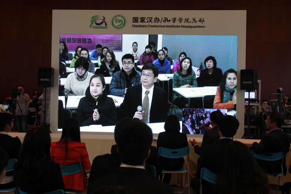 陳群和我校國際漢語教師研修基地師生通過網(wǎng)真系統(tǒng)與大會現(xiàn)場“隔空對話”