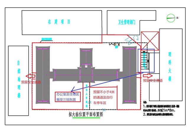 中山北路校區三館的屋面將于3月3日開始進行維修,施工時間3個月,預計到5月底竣工。根據施工管理規定,施工期間將搭設臨時圍擋、設置臨時辦公區域,大臨設施方案詳見下圖。