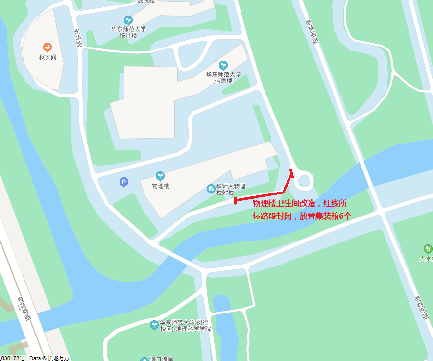 因閔行校區物理樓修繕改造工程,將對物理樓南側沿河道路部分路段進行封閉。 施工時間為 2021 年 4 月 18 日至 8 月 30日。