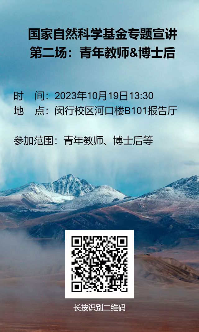 召開時間:2023年10月19日(周四)13:30 召開地點:閔行校區河口樓B101報告廳 參加范圍:青年教師、博士后等