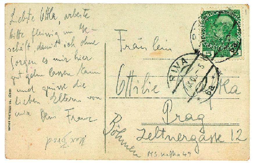 1909年9月7日,弗朗茨·卡夫卡從里瓦寄給小妹奧特拉的第一張明信片的正面和背面。上面寫著:“親愛的奧特拉,請在店里勤奮工作,這樣我就可以無憂無慮地在此地度過愉快的時光,向親愛的父母問好,你的弗朗茨”。明信片下方還有馬克斯·布羅德倒寫的簽名(本版圖片除注明外均由作者提供)