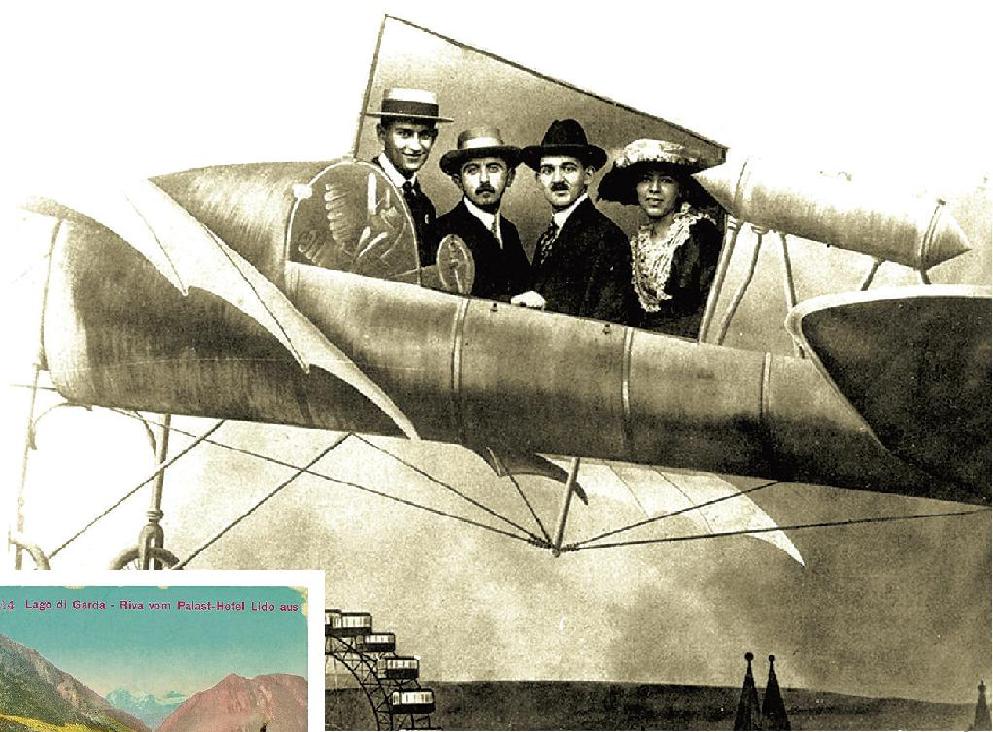 每到一地,卡夫卡不會錯過當地的教堂,城堡,名人故居,在觀光之余抓住一切機會游泳,似乎在旅途中,卡夫卡對自己身體的羞恥感減輕了很多。卡夫卡的好奇心絕不止于文學和藝術,他也熱衷于了解最先進的科技。和布羅德兄弟倆在里瓦度假之際,一則布雷西亞航空展的消息流傳開來,聽說幾位著名的飛行員也將趕來意大利,為公眾表演飛行藝術,幽靜的湖光山色頓時失去了吸引力,他們仨決定前往布雷西亞一睹盛事。飛行展的觀眾席里除了意大利的王公貴婦、政治名流,還有歌劇大師普契尼和著名作家加布里埃爾·鄧南遮。26歲的卡夫卡站在一張凳子上,飛行員路易·布萊里奧折騰了很久,終于成功駕駛著飛機從他頭頂飛過,“所有人都抬頭看著他,所有人的心都被他占滿了。在距離地面20米高的地方,一個人被困在一個木制框架里,在與自愿接受的,看不見的危險斗爭。而我們站在下面,完全被排斥在外,空洞地看著他”——這是卡夫卡第一次目睹人類脫離大地的束縛,沖向藍天,心中充滿驚異和敬畏。而他的作家同行——個子不到一米六的鄧南遮則勇敢地爬進了飛機后座,請求飛行員科蒂斯帶他飛離地面,哪怕只是幾米高。