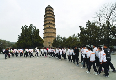 觀眾在陜西延安寶塔山參觀。新華社