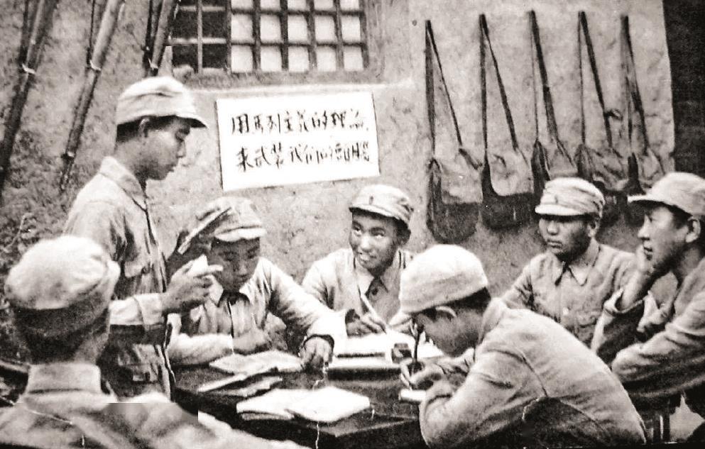 延安整風運動是加強黨的建設的成功實踐和偉大創舉。圖為戰士們在整風運動中學習馬列主義。