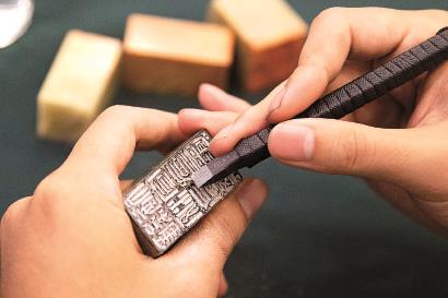 日前,華東師范大學美術學院書法篆刻專業學生以“大夏百詠”為主題現場篆刻印章。明年是大夏大學創建100周年,大夏大學是華東師范大學的前身之一。 本報記者 賴鑫琳 攝