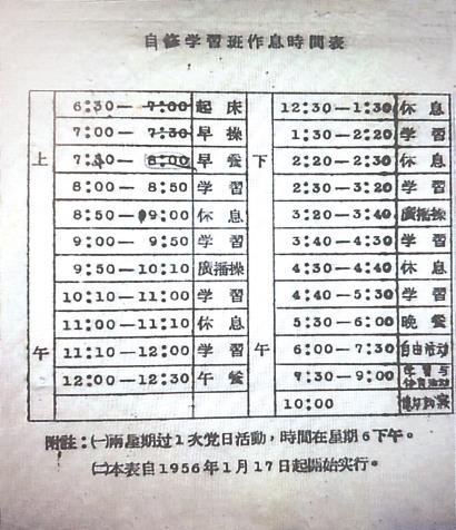 在生活管理方面,學員須遵守自修班作息時間表,“每天按規定的作息時間作息,星期六下午五時半后放假,星期一上午八時前須準時返回自修”。在學習時間內非經請假不得隨意外出、不得會客;如因特殊情況需在外住宿者,應經過小組長同意。