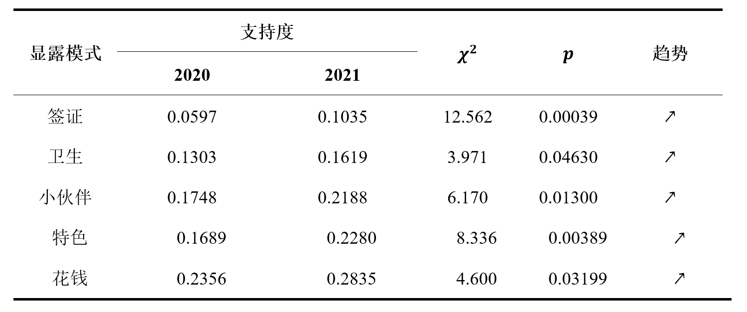 而后一時(shí)間段的顯露模式識別結(jié)果大不相同。“簽證”和“衛(wèi)生”開始成為人們關(guān)注的焦點(diǎn)。結(jié)合時(shí)事新聞可知,2020-2021年,越來越多的國家開始限制境外人員輸入,可以解釋“簽證”的關(guān)注度上升明顯的原因,這也在側(cè)面說明國內(nèi)用戶對于跨境旅行的需求較大。“衛(wèi)生”一詞則解釋了這個(gè)時(shí)間段內(nèi)用戶對于旅游出行的安全需求。旅游作為一項(xiàng)重要的人口流動(dòng)活動(dòng),順理成章成為病毒傳播的重要途徑。旅游產(chǎn)品的衛(wèi)生狀況、旅游目的地的防疫措施、個(gè)人在旅途中的衛(wèi)生防護(hù)等都成為該時(shí)期安全需求的一個(gè)重要方面。