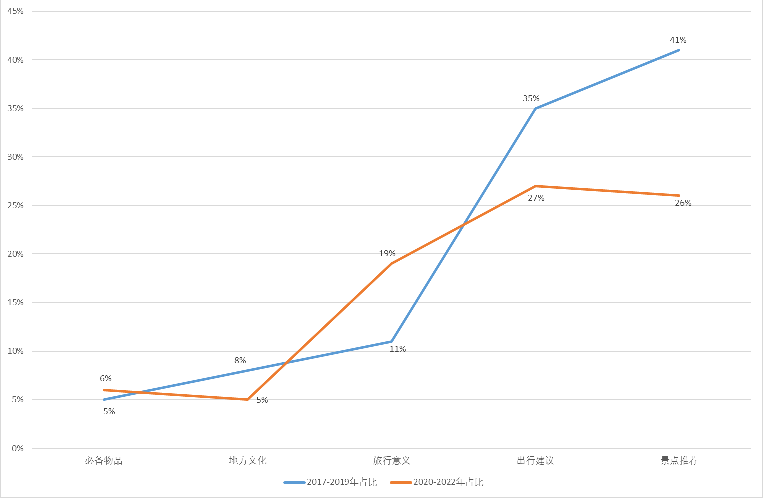 收集知乎平臺(tái)“旅游攻略”話題下“精華”欄目的所有用戶回答數(shù)據(jù),以2019-2020年為分界線,將數(shù)據(jù)劃分為“新冠疫情暴發(fā)前”和“新冠疫情暴發(fā)后”兩個(gè)數(shù)據(jù)集,借助LDA主題分類模型提取、歸納兩個(gè)數(shù)據(jù)集的數(shù)據(jù)主題并統(tǒng)計(jì)各主題數(shù)量,發(fā)現(xiàn)在新冠疫情暴發(fā)后,地方文化、出行建議和景點(diǎn)推薦三個(gè)主題的關(guān)注度從發(fā)文數(shù)量到占比均有所下降,其中出行建議和景點(diǎn)推薦兩個(gè)主題的占比下降幅度較大,同時(shí)旅行意義主題的關(guān)注度占比有較大幅度提升。說明在疫情暴發(fā)之后,用戶們對于旅行的需求關(guān)注從單純的享受旅行更多轉(zhuǎn)向了精神富足。能夠正常出行陪伴家人、再次到記憶深刻的目的地游玩、尋求機(jī)會(huì),從繁重的工作中解放出來等都成為用戶們關(guān)注的對象。探究旅行對于個(gè)人精神層面的價(jià)值供給成為該階段的重要部分。