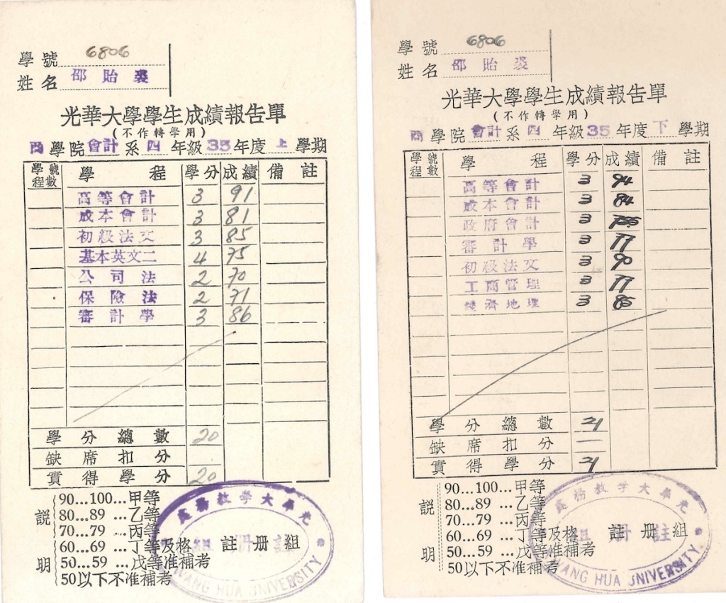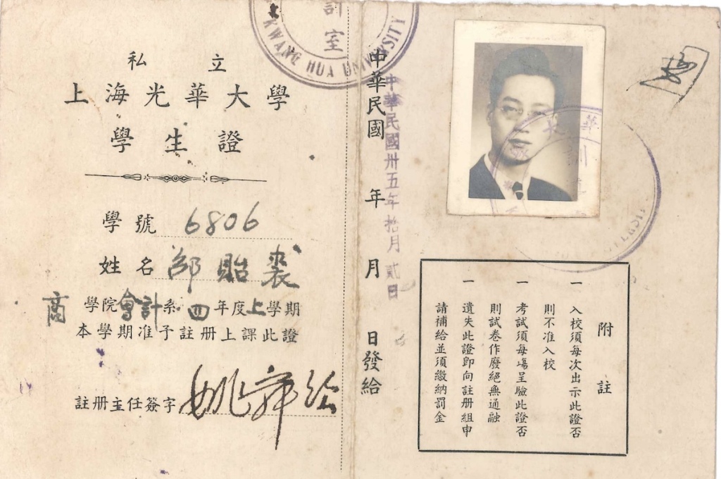 1945年抗日戰(zhàn)爭(zhēng)勝利,因當(dāng)時(shí)上海商業(yè)較發(fā)達(dá),父親又從事商業(yè),認(rèn)為學(xué)習(xí)商科有出路,因此轉(zhuǎn)入本市漢口路證券大樓私立光華大學(xué)商學(xué)院會(huì)計(jì)系三年級(jí)讀書(shū),學(xué)習(xí)頗有成績(jī)。1947年8月?lián)喂馊A大學(xué)商學(xué)院會(huì)計(jì)系助理,1947年12月大學(xué)畢業(yè)。因?qū)W習(xí)成績(jī)優(yōu)良,本校留用,擔(dān)任光華大學(xué)商學(xué)院會(huì)計(jì)系專任助教及講師職,直至上海解放。