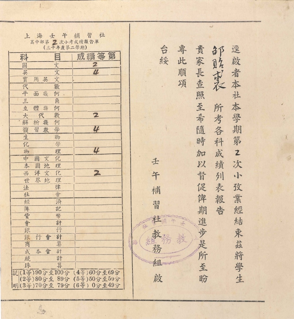 在解讀這一成績(jī)報(bào)告單之前,有必要對(duì)壬午補(bǔ)習(xí)社這一機(jī)構(gòu)作一介紹。1941年底太平洋戰(zhàn)爭(zhēng)爆發(fā)后,日軍進(jìn)入租界,光華大學(xué)為應(yīng)對(duì)時(shí)局之變,對(duì)學(xué)校建制作出重大調(diào)整,名義上停辦了滬校大學(xué)部及附中部,而改設(shè)誠(chéng)正文學(xué)社、格致理商學(xué)社、壬午補(bǔ)習(xí)社,使得大中學(xué)生得以繼續(xù)學(xué)業(yè),同時(shí)維系學(xué)校命脈。這里的壬午補(bǔ)習(xí)社其實(shí)就是光華大學(xué)附中改頭換面的另一個(gè)名稱而已,其辦學(xué)地點(diǎn)與師生均沒(méi)有改變。弄清楚壬午補(bǔ)習(xí)社就是光華附中的這一事實(shí)之后,關(guān)于邵貽裘1938年以后是不是繼續(xù)在光華高中讀書(shū)的問(wèn)題也就不言自明了。