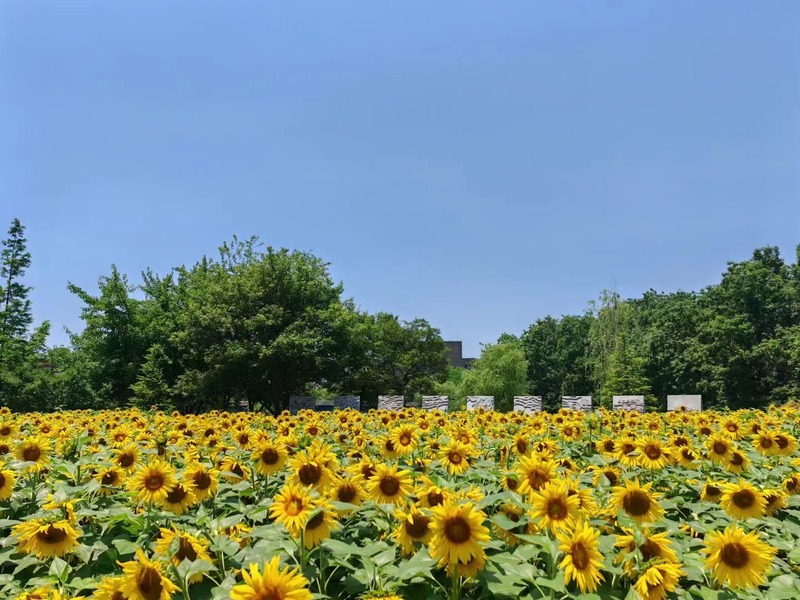 從普陀校區(qū)的校訓(xùn)碑花壇、辦公樓前花壇、圖書館前草坪,到閔行校區(qū)的文脈廊畢業(yè)花海區(qū)域,兩校區(qū)約1600平方米的24000多株向日葵,競相盛放、向陽而生。