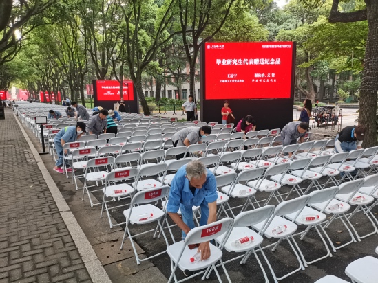 為即將踏上新征程的上理工學(xué)子上最后一課的,除了“大家長”丁曉東,還有來自全校后勤、物業(yè)、保衛(wèi)等提供外圍支持和保障部門的教職員工。原來,就在典禮前夕,上海突降暴雨,現(xiàn)場幾乎所有的座椅上都有積水和飄落的枝葉等異物,眼看無法正常使用了。第二天清晨5點(diǎn),一小時內(nèi),學(xué)校北區(qū)和南區(qū)物業(yè)、校園綠化、應(yīng)急搶修、垃圾分類、防汛防臺等單位近30人的奮戰(zhàn),將近3000把座位被清理完畢,保障了典禮順利進(jìn)行。