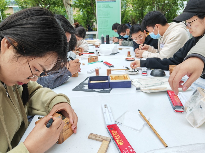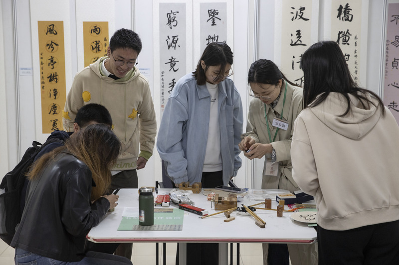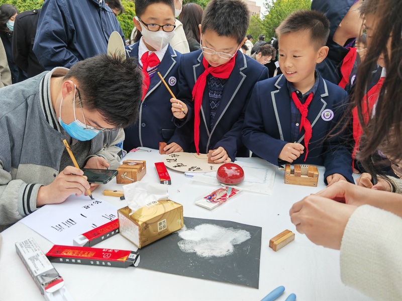 而在午間,作為教育部中華優(yōu)秀傳統(tǒng)文化篆刻傳承基地,校園蘭亭書法(篆刻)節(jié)的體驗區(qū),更是引來華東師范附屬中小學的“紅領(lǐng)巾”們執(zhí)起刀筆,通過大哥哥大姐姐手把手教授,在方寸之間刻下篆書“大”字。