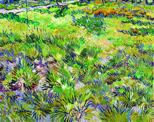 在這幅作品中,梵高細致描繪了一片草地和雜草,幾只白色的蝴蝶正在草地上盤旋。畫面上方是一條通向遠方的小徑,給人以無限遐想。梵高將濃墨重彩的筆觸在不同方向上彼此疊加,呈現出一片豐富多彩、栩栩如生的動態。他調和了綠色、黃色、赭和白色,又點綴藍色、丁香色以及紫色來描繪草地豐富的色調,突出和強調對比色和補色的運用。
