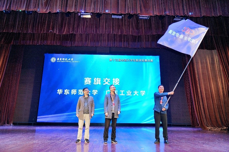 ??在頒獎典禮上,頒獎嘉賓為獲獎學生頒獎。華東師范大學數學科學學院院長呂長虹教授與廣東工業大學教務處處長、數學與統計學院院長王振友教授交接賽旗。