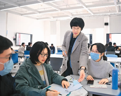 南開(kāi)大學(xué)依托數(shù)字技術(shù),建立研討型智慧教室。圖為老師和學(xué)生在智慧教室交流。(二〇二一年三月)新華社發(fā)