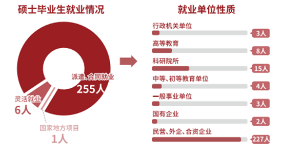 上海科技大學本科畢業生以境內升學和境外深造為主要去向,超過14%直接就業的本科畢業生,其平均年薪為14.88萬元。而2022屆碩士畢業生就職就業占比為78.44%,單位包括華為、阿里巴巴、騰訊、百度、小米、上海華力、聯想、陶氏化學、英偉達、支付寶等國內外知名企業。從就職單位性質來看,227人就職于民營、外資、合資企業,占比最高,達86.64%。