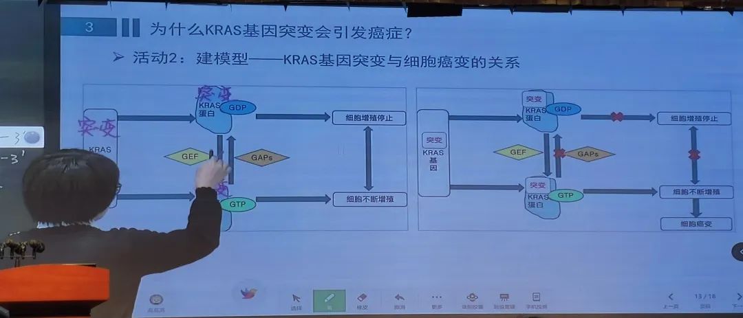 從課前孵化階段學(xué)生們開展的頭腦風(fēng)暴,到課中生長階段圍繞學(xué)生們梳理出的問題,閆高潔設(shè)置的3個探究活動情景,再到課后反哺階段布置的課后任務(wù)——根據(jù)KRAS基因突變引起細(xì)胞癌變的致病機(jī)理,設(shè)計(jì)一份治療方案。一堂生物課,將學(xué)生們的興趣一次又一次引向了高潮。